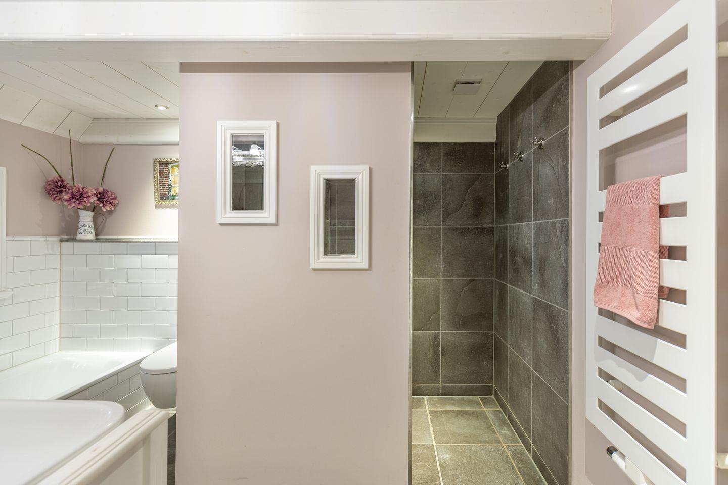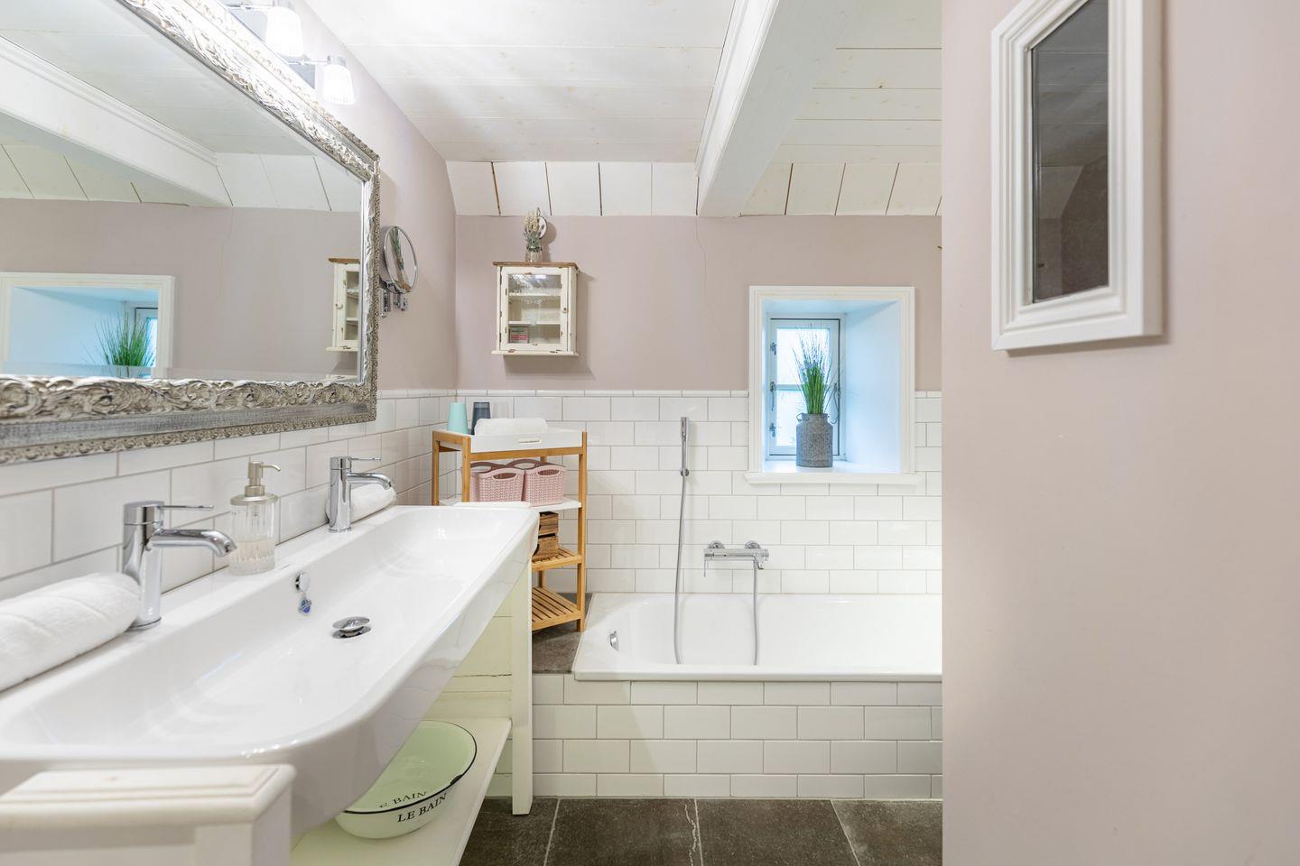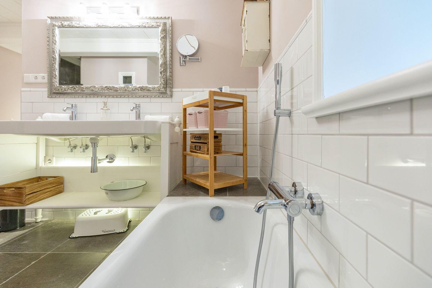 Das Badezimmer bietet eine bodengleiche Dusche. Ergänzt wird die Ausstattung durch eine Badewanne, die sich für entspannte Momente eignet. Ein großer Waschtisch mit zwei Armaturen schafft komfortable Ablageflächen und erleichtert die Nutzung für mehrere Personen. Die Kombination aus weißen Fliesen, Holzdetails und dezenten Rosétönen verleiht dem Bad eine freundliche Atmosphäre. Zusätzlich steht ein separates Gäste WC zur Verfügung, das den Komfort im Alltag erhöht.