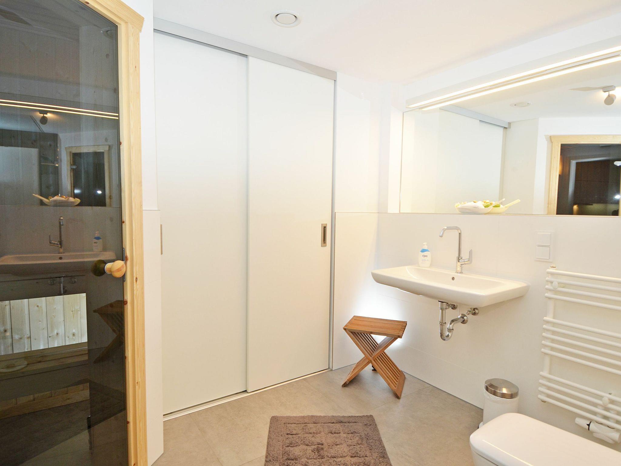 Zur Verfügung stehen zwei Bäder mit jeweils großen ebenerdigen Duschen, zwei Schlafzimmer mit Fernsehern und einem Doppelbett bzw. zwei Einzelbetten (1,00m x 2,00m). Im Wohnbereich bietet ein Schlafsofa (1,60 x 2,00 m) eine zusätzliche Übernachtungsmöglichkeit für weitere zwei Gäste.