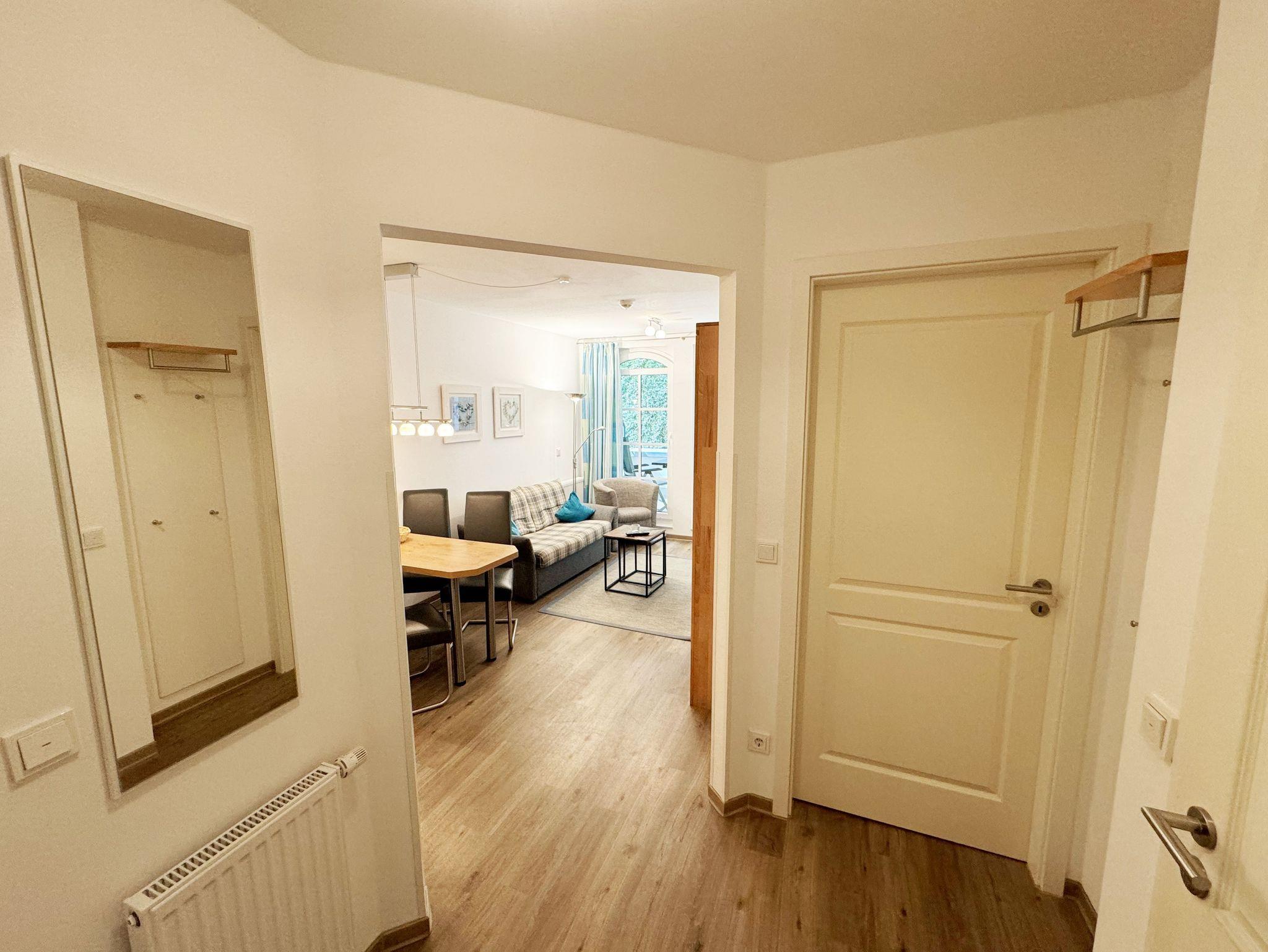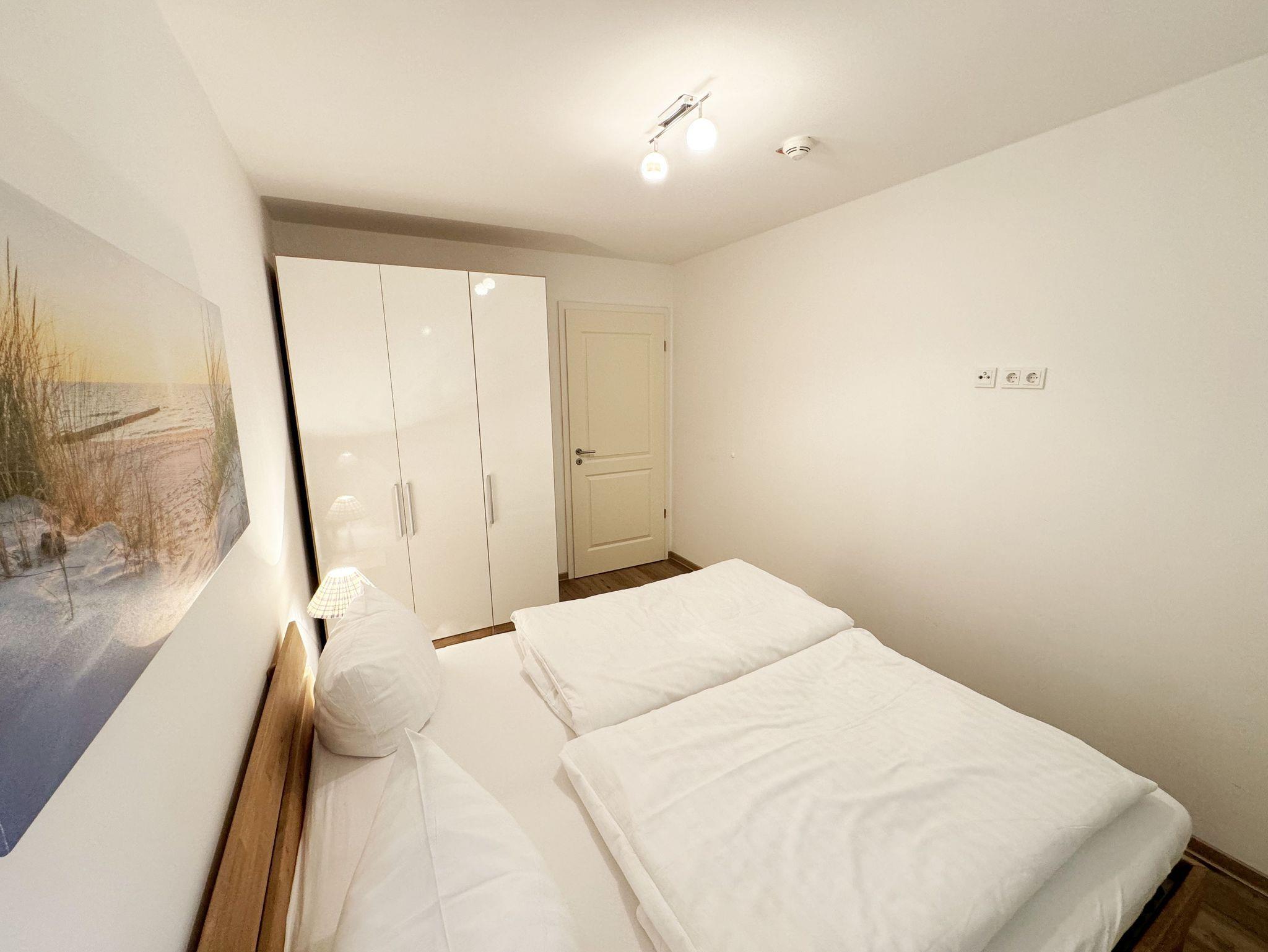 Herzlich Willkommen in Ihrer Nichtraucher/Ferienwohnung, die mit viel Liebe zum Detail ausgestattet und eingerichtet worden ist. Sie wohnen in einer 2-Zimmer Wohnung (ca. 37 qm), die für 2 bis 3 Personen ausgelegt ist. Die Wohnung A 3.15 befindet sich in der 2. Etage und ist per Fahrstuhl vom Haupthaus durch den Flur bequem zu erreichen. In der hellen Wohnung finden Sie einen kombinierten Wohn-, Koch- und Essbereich. Die moderne integrierte Küchenzeile lässt keine Wünsche offen. Eine Mikrowelle mit Grillfunktion, Ceranfeld, Abzugshaube, Spülmaschine, Kühlschrank mit Gefrierfach, Kaffeemaschine, Toaster, Wasserkocher und andere praktische Helfer lassen beim Kochen keine Wünsche offen. Ein Essplatz mit 3 Stühlen ist im Küchenbereich integriert. In dem sich anschließenden Wohnbereich ist eine gemütliche Couch (lässt sich schnell zu einem bequemen Bett für eine Personen umbauen 1,30 m x 1,95 m) mit Sessel und Couchtisch, Leselampe, kleine Anrichte, Smart-TV mit Soundbar, DAB-Radio sowie eine Vitrine vorhanden. Auch auf einen Internetanschluss (WLAN) müssen Sie im Urlaub nicht verzichten. Dieser ist für Sie inklusive! Durch die großen lichtdurchfluteten Balkonfenster gelangen Sie direkt auf den bestuhlten Balkon, der mit einer Westausrichtung ins Grüne einlädt. Das Schlafzimmer ist mit einem Doppelbett (1,80 m x 2,00 m), Nachttischkonsolen, Kleiderschrank, Smart-TV, Herrendiener, Insektenschutzgitter und Verdunklungsplissees liebevoll eingerichtet. Das moderne Bad ist mit einer ebenerdigen Dusche mit Klarglasfront, Waschtisch, WC, Haartrockner und einem Handtuchheizkörper ausgestattet. Ein eigener PKW-Stellplatz (Nr.103, Einfahrtshöhe 2,00m) befindet sich in der Tiefgarage des Hauses. Im Keller des Hauses haben Sie die Möglichkeit eine Waschmaschine/Trockner gegen Gebühr zu nutzen. Mit dem Fahrstuhl des Hauses A gelangen sie in das Untergeschoss der Meeresblickanlage, wo Sie ein großzügiger und heller Wellnessbereich erwartet. Hier können sie in einem Pool kleine Bahnen schwimmen, in 2 Saunen Ihren Kreislauf in Schwung bringen, in einem dazugehörigen Ruheraum Ihren Körper wieder beruhigen, in einer Schneckendusche sowie weiteren Duschen das kühle Nass genießen und auf einer Außenterrasse mit Außendusche die frische Luft einatmen. Die Erstausstattung eines Wäschepaketes (komplette Bettwäsche, 1 Duschhandtuch, 2 kleine Handtücher) können Sie bis 14 Tage vor Anreise gegen einen Aufpreis dazu buchen oder durch eigene ergänzen. Ab 2 gebuchten Paketen erhalten Sie einmalig 1 Geschirrhandtuch und 1 Duschvorleger hinzu.