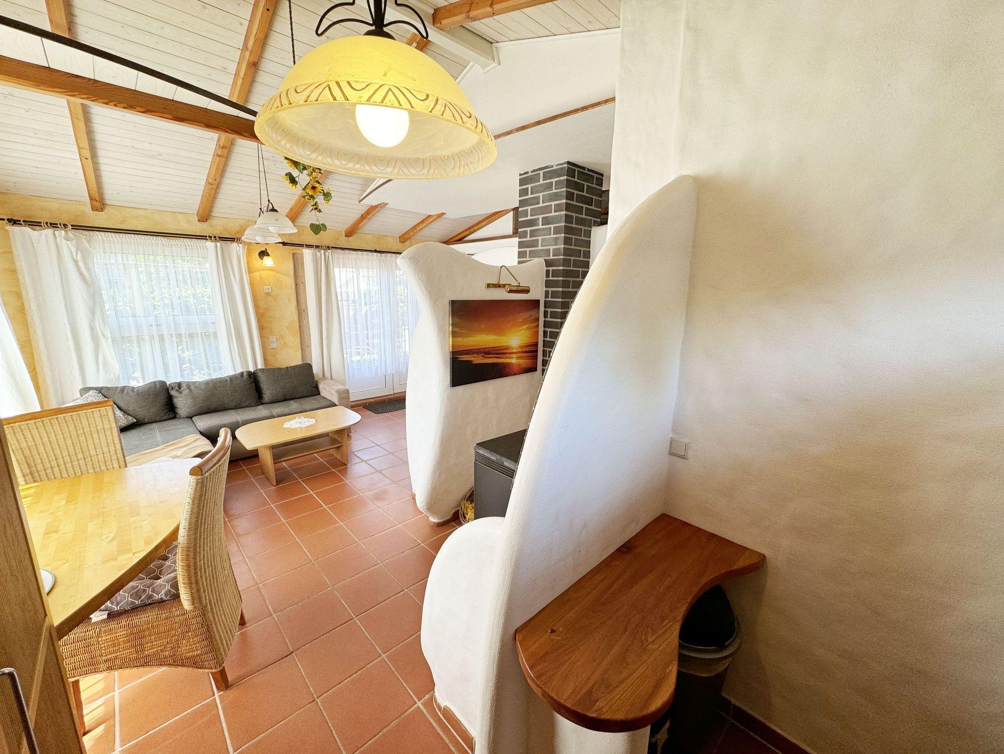 Das Nichtraucherferienhaus Thea umfasst ca. 48 m² und bietet Ihnen Platz für max. 2 Erwachsene. Der offene Wohnbereich ist mit einer Eckcouch, Couchtisch, Radio mit CD-Player, DVD-Player und einem Smart-TV ausgestattet. Auch auf einen Internetanschluss (WLAN) brauchen Sie im Urlaub nicht verzichten. Dieser ist inklusive für Sie. In Verlängerung schließt sich der Essplatz an. Die vollausgestattet Küchenzeile verfügt über einen Backofen, Ceranfeld mit Dunstabzugshabe, Geschirrspüler, Mikrowelle, Kühlschrank mit Eisfach, Kaffeemaschine, Toaster, Wasserkocher sowie diverse Küchenutensilien. Für gemütliche Abende, gerade in der kälteren Jahreszeit, sorgt ein Kamin. Das offene Schlafzimmer verfügt über ein Doppelbett (1,80 m x 2,00 m), Nachttischablagen sowie einen Kleiderschrank. Vom Wohnbereich gelangen Sie auf die bestuhlte Terrasse. Das Tageslicht-Bad wird durch eine Eckdusche, Handtuchwärmer, Fön, WC und Waschtisch abgerundet. Alle Räumlichkeiten sind mit einer Fußbodenheizung sowie Fliesen versehen worden. Mit einem eigenen und mitgebrachten Schlafplatz sind max. 2 Haustiere gegen eine Gebühr gern gesehene Gäste. Im separaten Waschhaus können Sie gegen eine Kasse des Vertrauens eine Waschmaschine und einen Trockner nutzen. Ihre mitgebrachten oder auch geliehenen Fahrräder können Sie am Haus abstellen. Ein PKW-Stellplatz mit Ladestation befindet sich auf dem Grundstück. Die Erstausstattung eines Wäschepaketes (komplette Bettwäsche, 1 Duschhandtuch, 1 kleines Handtuch) können Sie bis 14 Tage vor Anreise gegen einen Aufpreis dazu buchen oder durch eigene ergänzen. Ab 2 gebuchten Paketen erhalten Sie einmalig 1 Geschirrhandtuch und 1 Duschvorleger hinzu.
