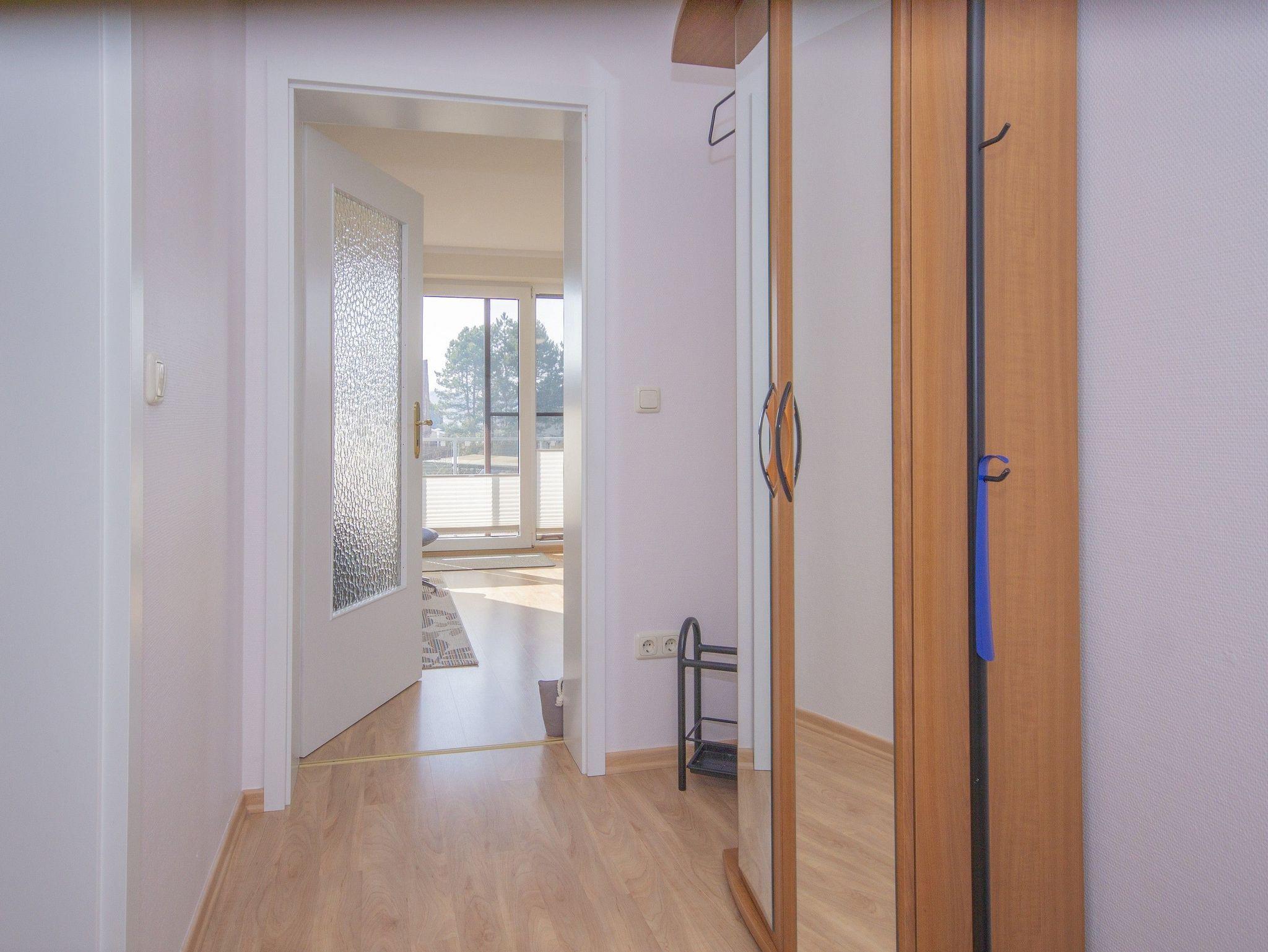 Die Ferienwohnung 4 im Obergeschoss im Haus Rügensonne verfügt über einen freundlichen Eingangsbereich, einen Balkon, einen gemütlichen Wohnbereich und ein separates Schlafzimmer.