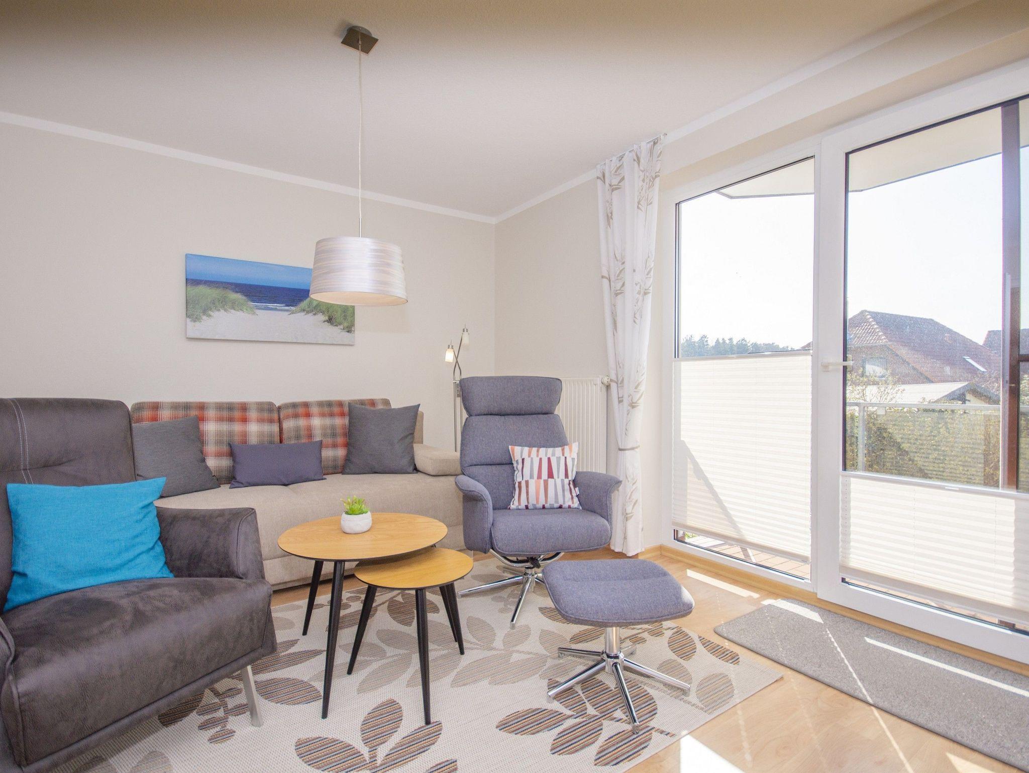 Der freundliche Wohnbereich bietet einen gemütlichen Ort zum Ausklingen der erlebnisreichen Tage auf Rügen. Hier befindet sich neben einem modernen Flachbild-TV auch eine außerordentlich komfortable Couchgarnitur, die eine optionale Aufbettung für bis zu 2 weitere Personen darstellt. Von diesem Zimmer erhalten Sie einen direkten Zugang auf den Balkon. Hier können Sie nach einem erlebnisreichen Strandtag in Baabe einfach mal die Seele baumeln lassen.