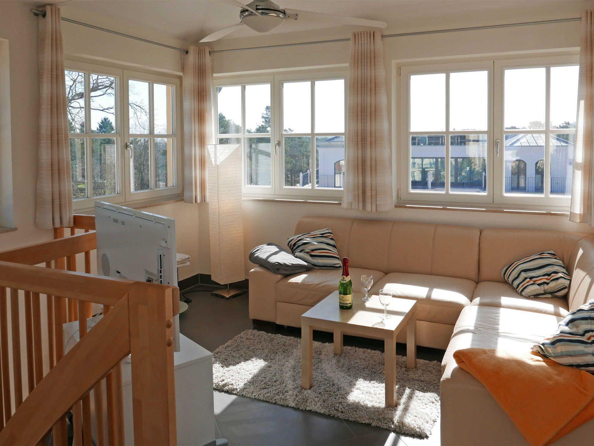 In dieser exklusiv-modernen 3-Zimmerferienwohnung für 4 Personen bleiben keine Wünsche offen. Auf 70 qm und 2 Ebenen befinden sich zwei Schlafzimmer mit jeweils einem Doppelbett (2x0,90m x 2,00 m und 1,40m x 2,00 m), ein Wohnzimmer, ein Esszimmer mit Küche, ein Duschbad sowie ein Gäste-WC. Auf der Dachterrasse können Sie die herrliche Aussicht auf die Ostsee genießen. Ein zusätzlicher Balkon mit Meerblick ist ebenfalls vorhanden, diesen erreichen Sie über eines der Schlafzimmer. In der Küche sind selbstverständlich alle Annehmlichkeiten vorhanden inklusive 4-Zonen-Ceranfeld, Backofen, Mikrowelle, Geschirrspüler, Kühlschrank und Abzugshaube. Besonders schön ist das Wohnzimmer im Turm, von hier aus haben Sie einen grandiosen Rundumblick.