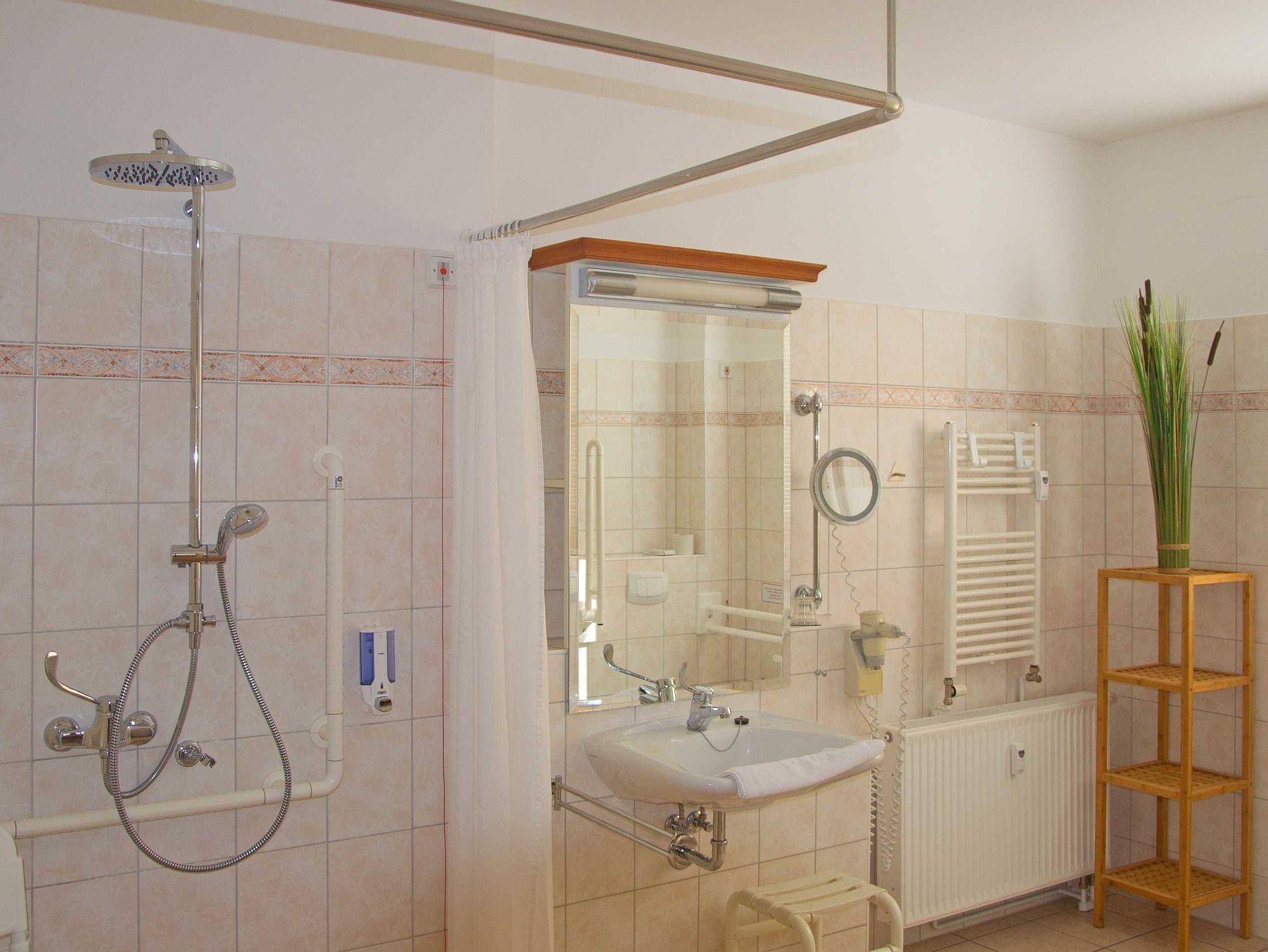 Mit besonderer Sorgfalt haben wir bei der Einrichtung auf die Belange von Gästen im Rollstuhl geachtet. Entsprechende Türbreiten, Ausstattung des Badezimmers, des Schlafzimmers, der Küchenzeile sowie Platzbedarf zum Wenden etc. garantieren eine größtmögliche Unabhängigkeit.