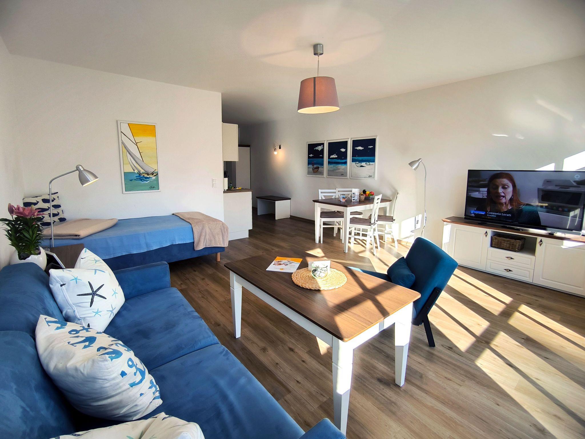 Helle schöne 2 Zimmerferienwohnung mit Meerblick und Balkon. Für die Wohnung sind neue geweißte Holzmöbel angefertigt worden. Die Küche ist komplett eingerichtetet und hat eine Geschirrspülmaschine und Backofen. Im Wohnbereich befindet sich ein Schlafsofa, der Ess- und Küchenbereich. von hier geht es auf den schönen Balkon mit Blick zum Meer. Am Ende der Wohnanlage befindet sich der nun neu restaurierte Mütherbau.
