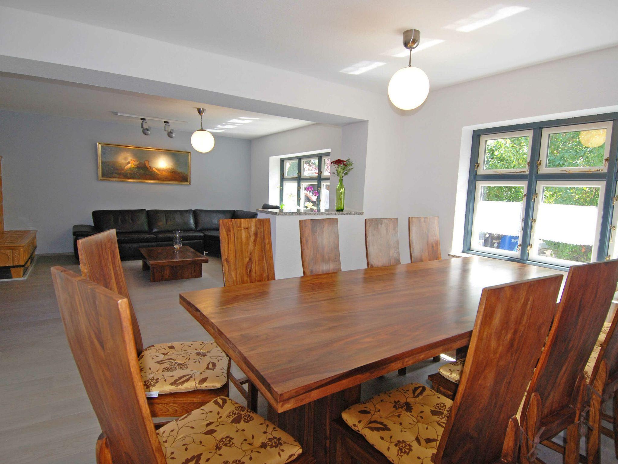 Die Fewo 1 im Erdgeschoss misst stolze 120 m² Wohnfläche und ist für bis zu 10 Personen ausgelegt. Über den Eingangsbereich mit Garderobe gelangen Sie in das geräumige Wohn- und Esszimmer. Dieses verfügt über eine Couchgarnitur, einen großen Kachelofen (ohne Funktion), ein Radio mit CD-Player, einen Fernseher mit DVD-Player sowie einen Esstisch für die ganze Familie. Die hochwertig ausgestattete Küche umfasst u.a. einen Ceranherd, einen Backofen, einen XXL-Kühlschrank, eine Spülmaschine, eine Mikrowelle und natürlich alles notwendige Kleininventar, damit Sie sich selbst bekochen können.