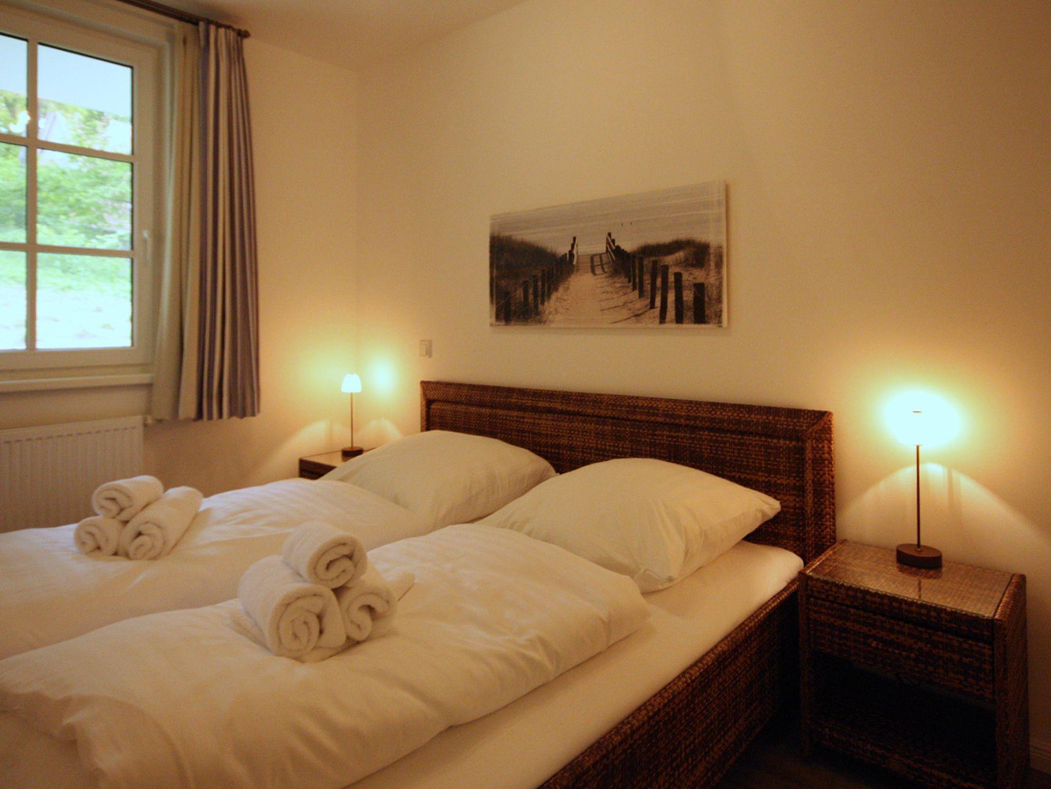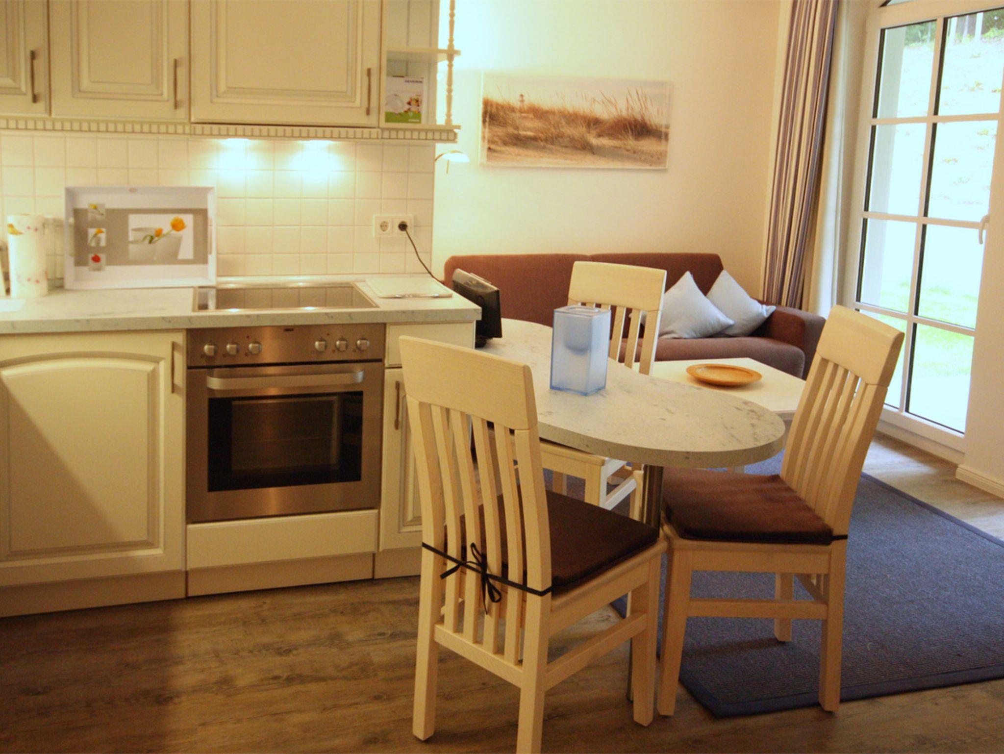 Die Ferienwohnung Strandläufer ist modern eingerichtet und hat eine private Terrasse mit vier Sitzplätzen, von der aus man einen seitlichen, eingeschränkten Meerblick durch die Kiefernbäume hat. Die Unterkunft bietet Platz für zwei Erwachsene und zwei Kinder bis 12 Jahren, für die ein Schlafsofa im Wohnbereich bereitsteht. Dort befindet sich außerdem eine Trennwand, hinter der der Schlafbereich mit Doppelbett ist. Der kombinierte Wohn-/Schlafbereich ist mit einem Fernseher, einem Radio und einem CD-Player ausgestattet.