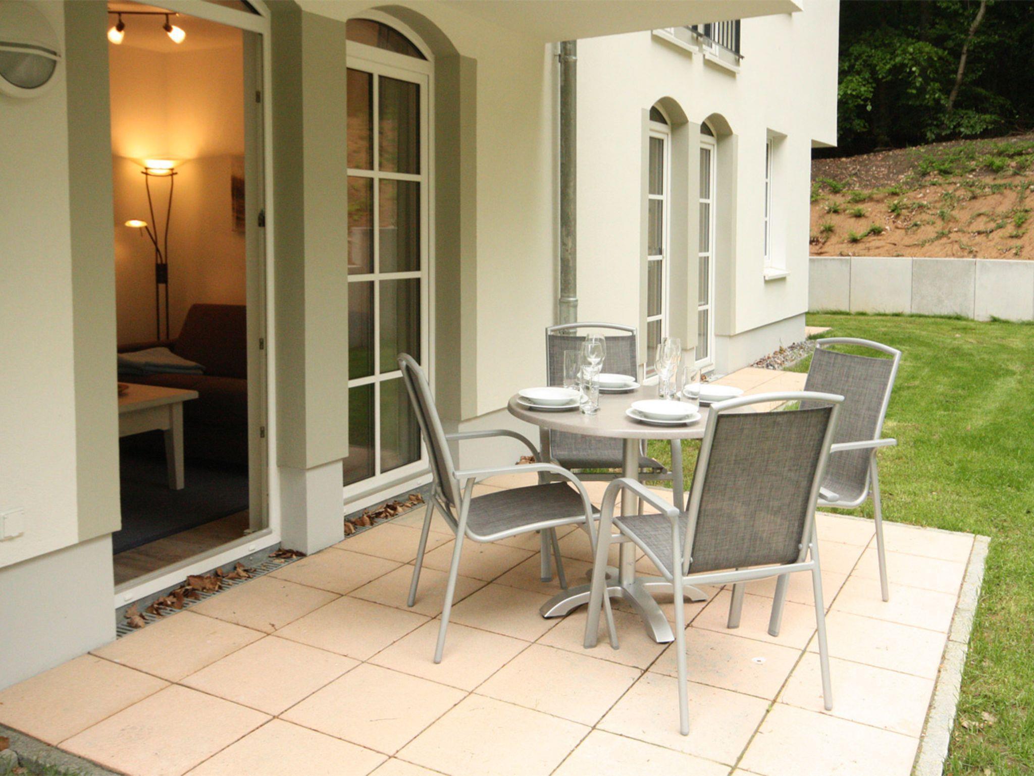 Die modern eingerichtete Ferienwohnung Strandläufer mit Schlafzimmer und Wohnzimmer hat eine schöne private Terrasse mit Blick zum Wald und seitlich zum Meer.