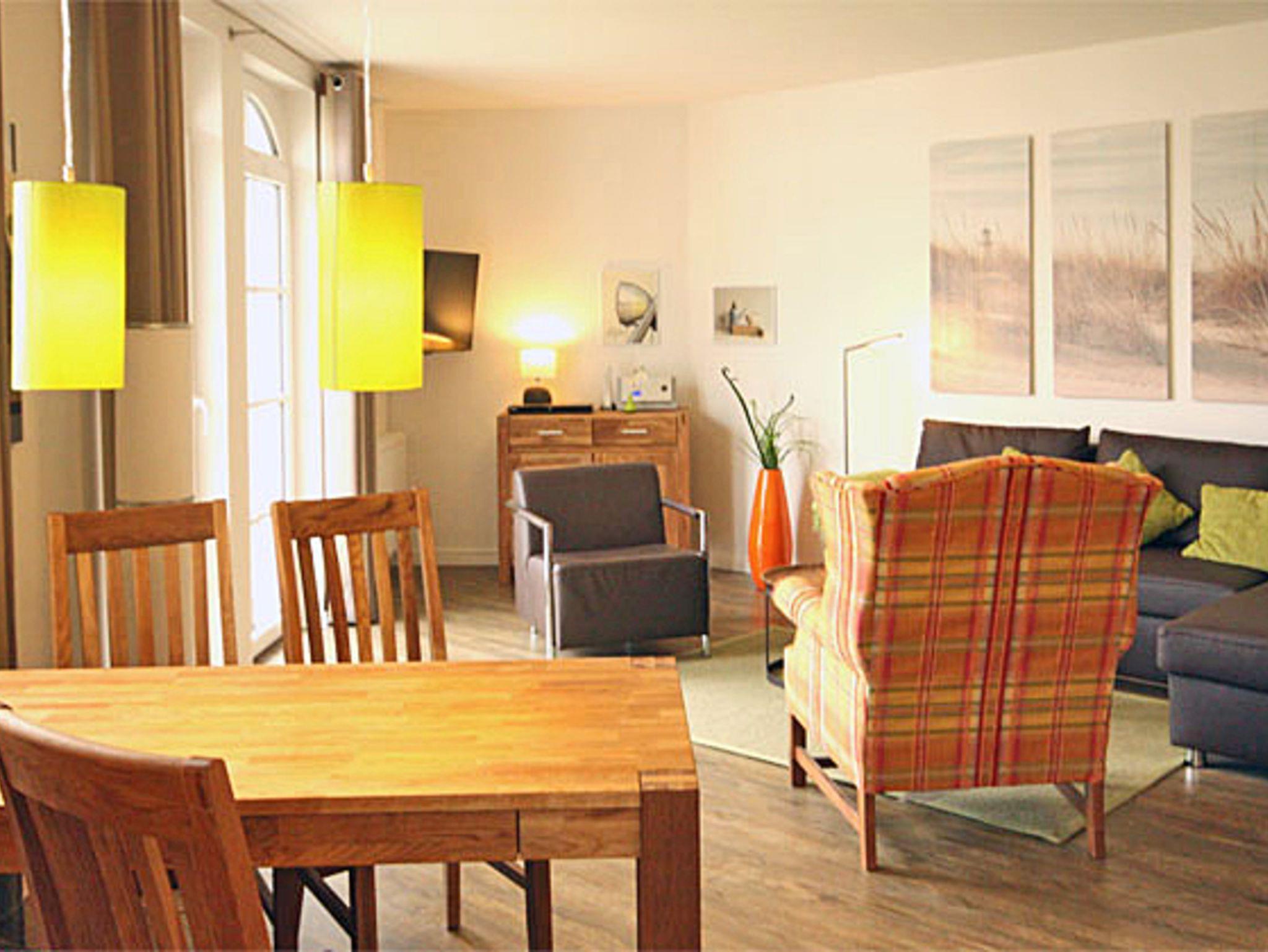 Der Wohnbereich ist für 4 Personen eingerichtet. Dort befindet sich das Schlafsofa für 2 Gäste, der möblierte Ostbalkon, ein Fernseher, ein Radio/CD-Player-Mini-Stereo-System sowie ein DVD- und Blu-Ray-Player. WLAN ist ebenfalls inklusive.
