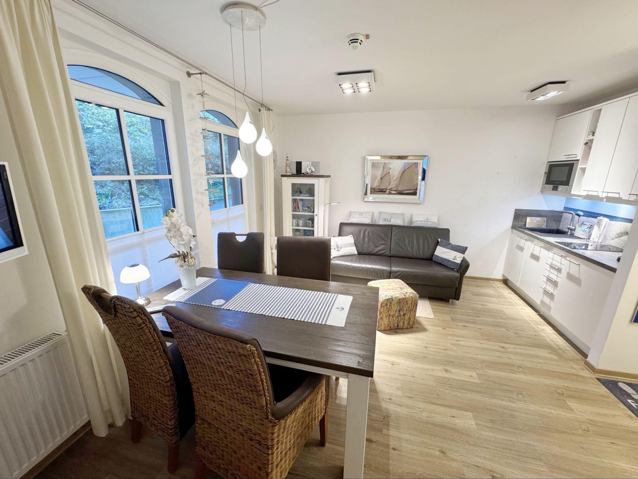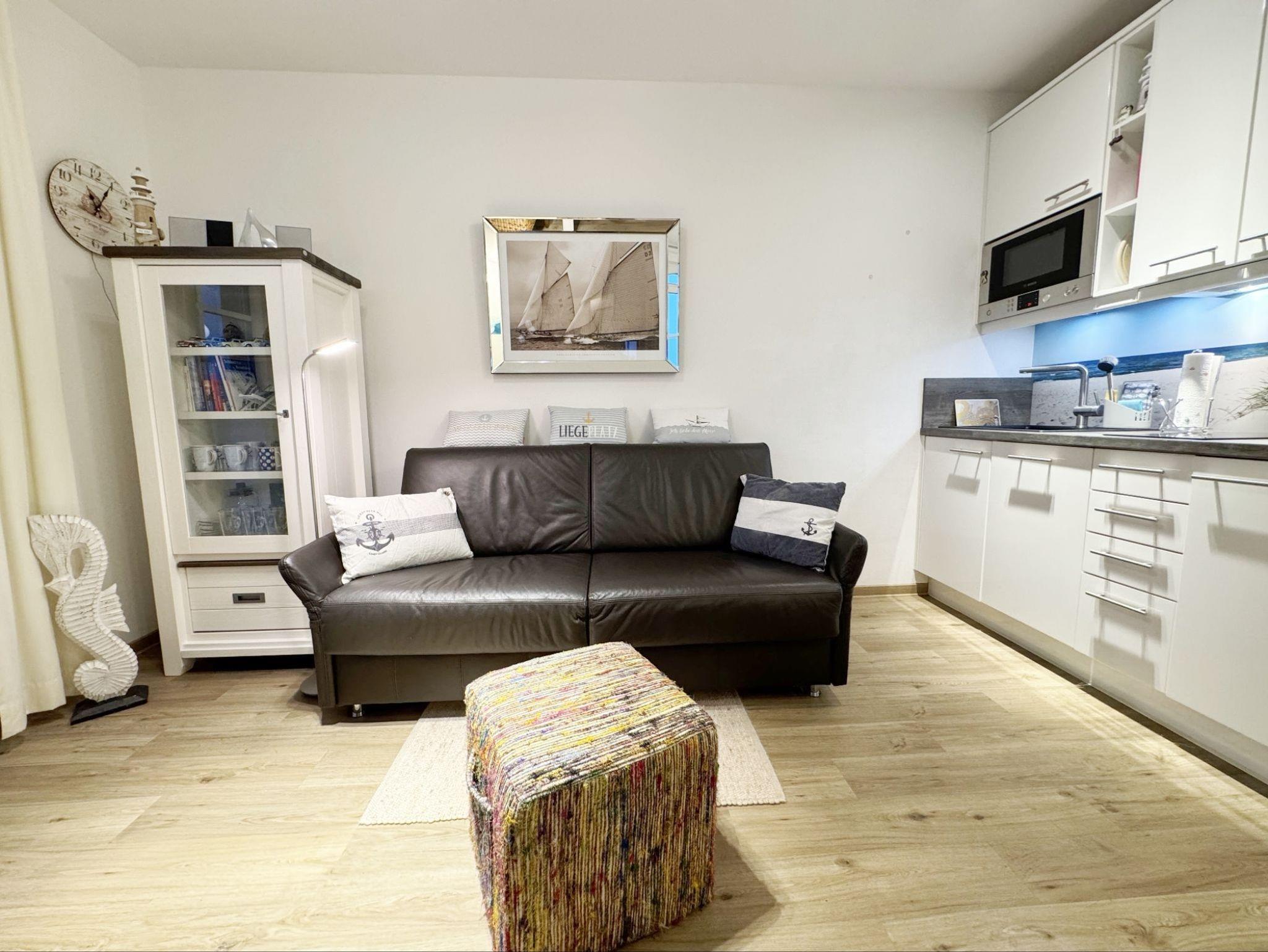 Willkommen in der geschmackvollen Ferienwohnung „Dinghy“ im Haus Meeresblick, einer Nichtraucher Ferienwohnung in Strandnähe, die ideal für einen komfortablen Aufenthalt bis zu max. 2 Personen geeignet ist. Die Erdgeschosswohnung bietet Ihnen eine Wohnfläche von ca. 41 qm und zeichnet sich durch eine durchdachte Raumaufteilung und moderne Ausstattung aus. Der Wohnbereich ist optimal ausgestattet. Hier finden Sie einen großzügigen Esstisch, zwei Vitrinen im Landhausstil, sowie eine Couch, ein Beistelltisch, eine Leselampe und einen Flachbild-TV mit integriertem Internetradio. Für den perfekten Sound sorgt das Panasonic iPhone 5, iPad, iPod Micro System, das Bluetooth, CD, USB und FM-Radio unterstützt. Der technische Bereich wird durch einen WLAN-Anschluss abgerundet. Ein Highlight der Wohnung ist die möblierte Terrasse (West), welche Sie vom Wohnbereich durch eine Insektenschutztür erreichen welche Ihnen zusätzlichen Außenraum bietet. Die angrenzende Pantry-Küchenzeile ist mit modernen Geräten ausgestattet, darunter eine Spülmaschine, ein Kühlschrank mit Gefrierfach des gleichen Herstellers. Weitere Küchengeräte wie ein Handmixer, ein Toaster, eine Mikrowelle mit Grill, eine Kaffeemaschine, eine De Longhi Nespresso-Maschine und ein Wasserkocher stehen zur Verfügung. Die beleuchtete Küchenzeile - mit integriertem Dunstabzug und 2 Zonen Cerankochfeld - sorgt für eine angenehme Atmosphäre beim Kochen. Das Schlafzimmer bietet einen komfortablen Rückzugsort mit einem LED-TV und einem stufenlos beheizbaren Wasserbett (2,00m x 2,10m), das aus zwei Kammern besteht sowie Nachttischablagen mit Beleuchtung. Ein großer Kleiderschrank mit drei Schubladen bietet ausreichend Stauraum, während ein Tresor im Schrank für zusätzlichen Schutz Ihrer Wertsachen sorgt. Ein Bücherregal, ein Insektenschutzgitter und eine Verdunklungsmöglichkeit komplettieren den Raum. Das innenliegende Badezimmer ist mit einem ebenerdigen Duschbad ausgestattet, das eine Sitzgelegenheit bietet. Ein großer Waschtisch, ein Kosmetikspiegel, sowie ein Föhn, ein WC und ein Handtuchhalter komplettieren die Ausstattung. Im kleinen Abstellraum befinden sich Reinigungsutensilien, eine Garderobe sowie ein Wäscheständer. Haustiere sind nicht erlaubt. Im Keller des Hauses haben Sie die Möglichkeit eine Waschmaschine/Trockner gegen Gebühr zu nutzen. Mit dem Fahrstuhl des Hauses A gelangen sie in das Untergeschoss der Meeresblickanlage, wo Sie ein großzügiger und heller Wellnessbereich erwartet. Hier können sie in einem Pool kleine Bahnen schwimmen, in 2 Saunen Ihren Kreislauf in Schwung bringen, in einem dazugehörigen Ruheraum Ihren Körper wieder beruhigen, in einer Schneckendusche sowie weiteren Duschen das kühle Nass genießen und auf einer Außenterrasse mit Außendusche die frische Luft einatmen. Ein PKW-Stellplatz (Nr. 63, Einfahrtshöhe 2,00m) ist für Sie in der Tiefgarage reserviert. Die Erstausstattung eines Wäschepaketes (komplette Bettwäsche, 1 Duschhandtuch, 2 kleine Handtücher) können Sie bis 14 Tage vor Anreise gegen einen Aufpreis dazu buchen oder durch eigene ergänzen. Ab 2 gebuchten Paketen erhalten Sie einmalig 1 Geschirrhandtuch und 1 Duschvorleger hinzu.