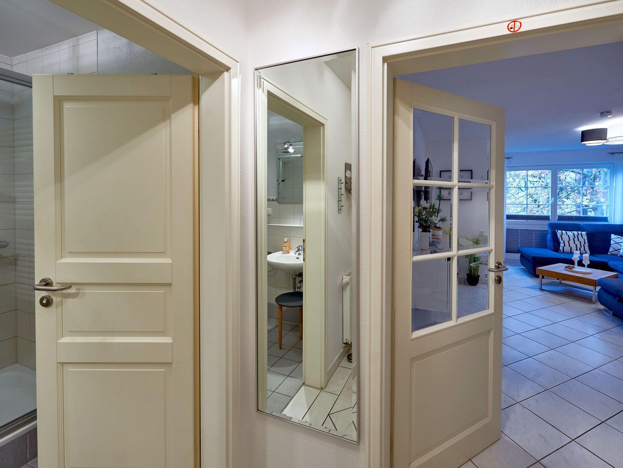 Das geflieste Badezimmer Ihres Urlaubsdomizils überzeugt mit Dusche/WC, einem beleuchteten Waschtisch, Fußbodenheizung und Fön. Für die Urlaubswäsche zwischendurch stehen im Untergeschoss des Hauses eine gemeinschaftlich nutzbare Waschmaschine sowie Bügelutensilien bereit. Die Nutzung ist kostenfrei.