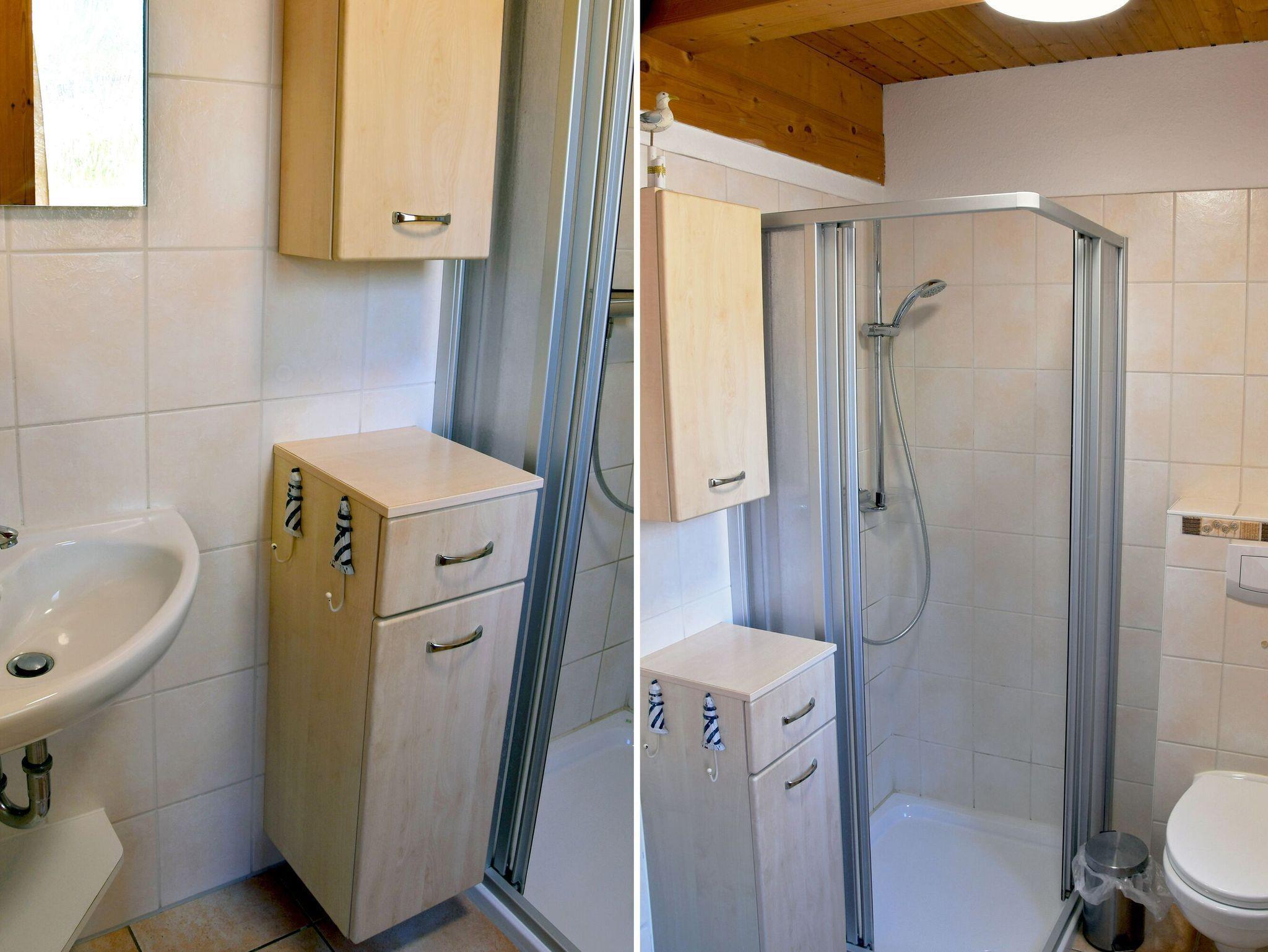 Damit es auch bei voller Hütte immer ganz entspannt zugeht, gibt es im Ober- und im Untergeschoss jeweils ein Bad mit Dusche/WC und Waschtisch.