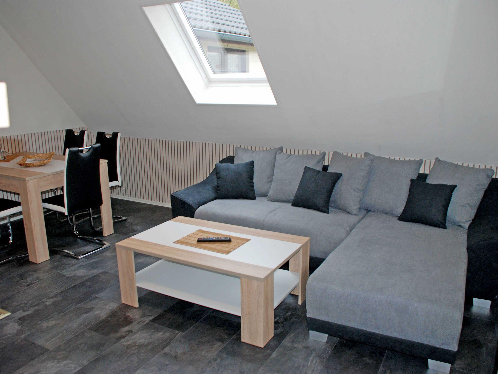 Im großen Wohnraum befinden sich eine Sitzecke mit Schlafcouch und ein Esstisch mit Stühlen, ein ein modernes Flachbild-TV-Gerät. Der Kamin hier sorgt im Winter für behagliche Gemütlichkeit. Die Wohnung verfügt über WLAN-Internet.