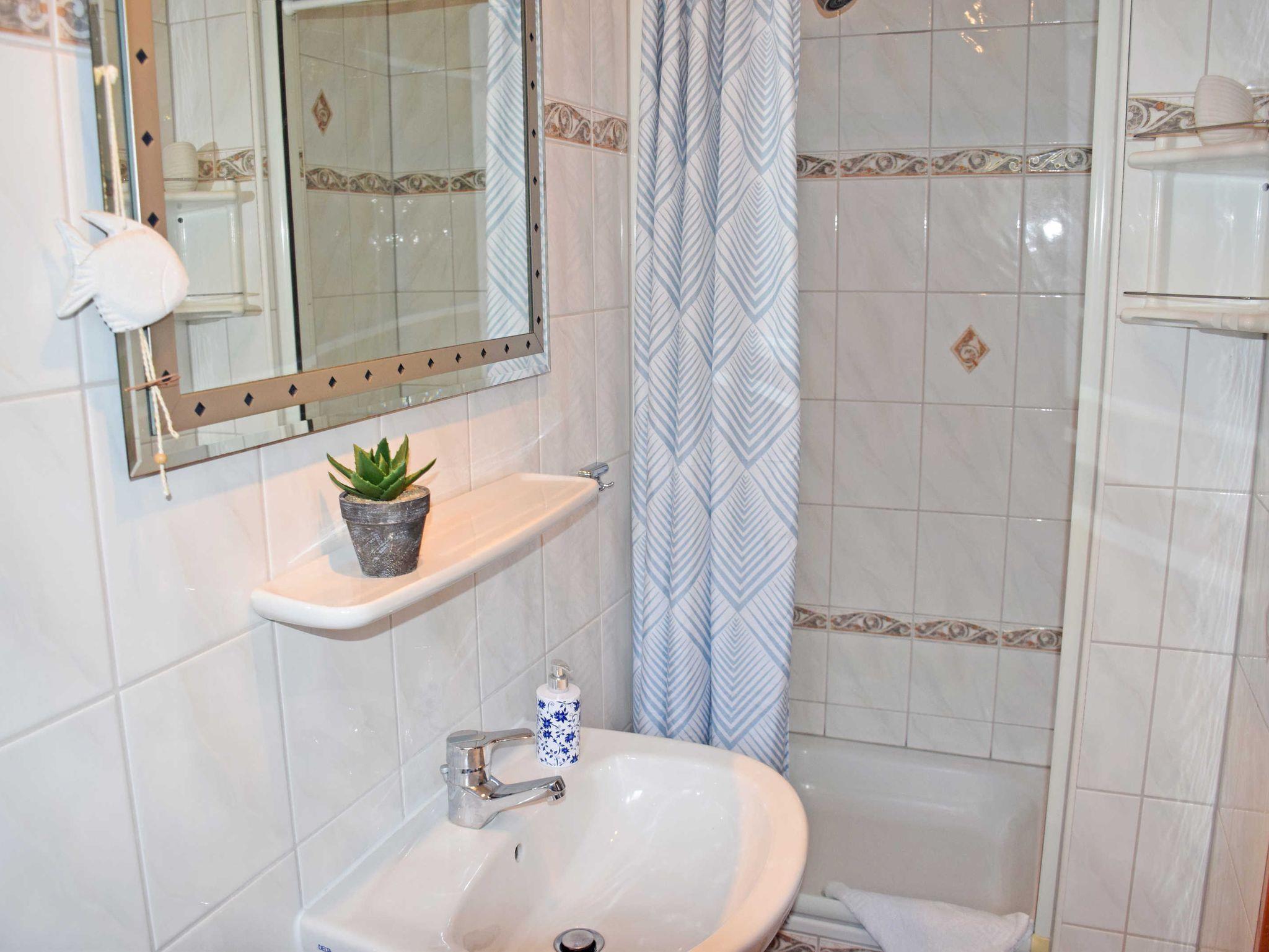 Das im Erdgeschoss liegende großzügige Schlafzimmer ist mit einem bequemen Doppelbett mit Nachtschränken und Leselampen sowie einem Kleiderschrank ausgestattet. Hier befinden sich auch eine Komode und ein Ankleidespiegel. Bei Ihrer Anreise liegen für Sie frische Handtücher bereit und die Betten sind selbstverständlich bereits für Sie mit Bettwäsche aufbezogen. Ein Wäschpaket (Wechsel) kann gegen Gebühr von 15 je Gast hinzugebucht werden. Das moderne Bad ist mit Dusche, WC und Waschtisch ausgestattet und verfügt über Tageslicht.