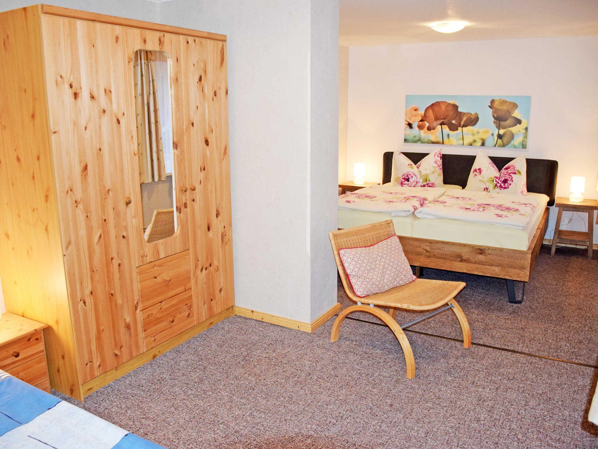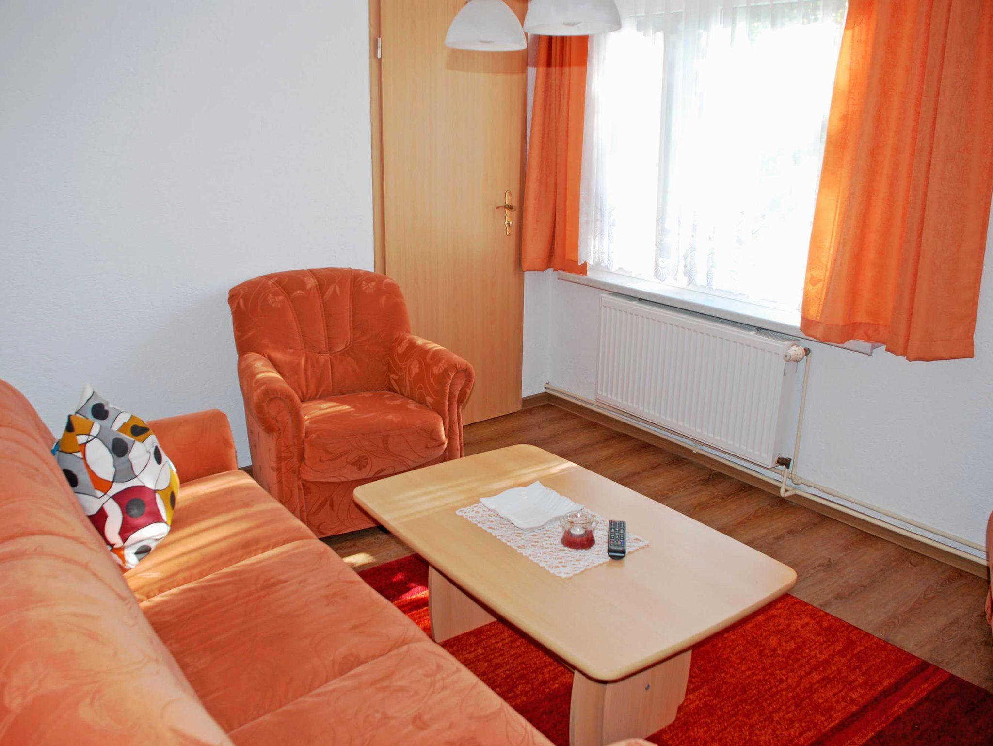 Die Ferienwohnung EG liegt im Erdgeschoss des Wohnhauses und verfügt über einen separaten Eingang WLAN. Sie ist ca. 40 qm groß, hat Platz für maximal 3 Erwachsene und wurde modern und liebevoll eingerichtet. Im Wohnraum befinden sich eine bequeme Sitzcouch mit Tisch und ein modernes Flachbild-TV-Gerät. Die separate Küche verfügt über einen Patryküche mit Herd, Wasserkocher, Kaffeemaschine, Toaster und Kühlschrank. Hier steht auch ein Esstisch mit Stühlen. Das Schlafzimmer ist mit einem bequemen Doppelbett mit Nachttischen und Leselampen sowie einem Kleiderschrank ausgestattet. Für einen dritten Gast steht hier noch ein Einzelbett. Ein kleines Kinderreisebett und ein Hochstuhl können auf Wunsch kostenlos zur Verfügung gestellt werden.