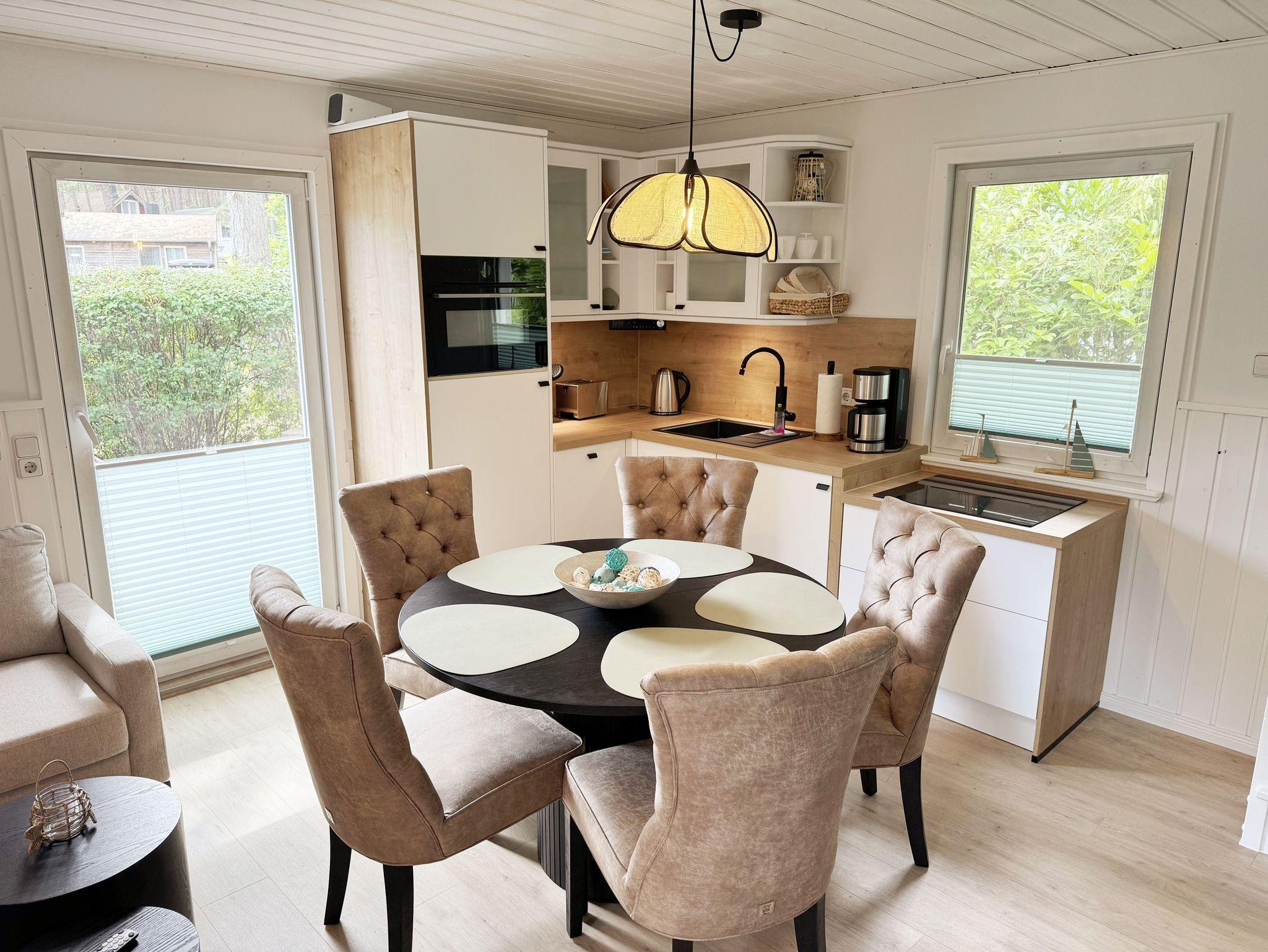 Das gemütliche 2005 in holzbauweise errichtete und 2025 renovierte Ferienhaus Strandmelodie (Nr.08c) mit einer Wohnfläche von 59 m² finden sie im Dünenpark Baabe, umgeben von Meer und Wald. Das optimal für 2 bis 4 Erwachsene + 1 Kleinkind bis 3 Jahre im Kinderreisebett ausgerichtete tierfreundliche Nichtraucherhaus betreten sie über einen kleinen Eingangsflur mit Garderobe. Im Erdgeschoß befindet sich der Wohn- und Essbereich mit gemütlicher Wohnlandschaft mit Urlaubslektüre, Stehlampe, Smart-TV, DAB-Radio mit Bluetooth und auch für einen Internetzugang ist gesorgt. Dieser ist für sie inklusive. Wer es abends noch etwas gemütlicher mag, der zündet sich den Kamin an und lässt den Tag bei einem prasselnden Feuer und einem Glas Wein ausklingen. Dem Wohnbereich angeschlossen ist die Einbauküche mit Geschirrspüler, Kühlschrank mit Gefrierfach, Ceranfeld, Backofen, Mikrowelle, Kaffeemaschine, Eierkocher, Wasserkocher und Waschmaschine mit Trocknerfunktion. Am Esstisch finden alle Personen Platz, wo auch für ein Hochstuhl gesorgt ist. Direkt vom Wohn-& Essbereich haben sie die Möglichkeit die Terrasse zu betreten, welche mit bequemen Terrassenmöbeln, einem Steingrill, einer Überdachung und Sonnenschutz ausgestattet ist. Das freundlich eingerichtete Schlafzimmer ist mit einem Boxspringbett (1,60m x 2,00m) mit verstellbaren Lattenrosten, Nachttischkonsole, Leseleuchten, Kleiderablage, einem Safe, einem Smart-TV, Verdunklungsmöglichkeiten und Kleiderschrank ausgestattet. Auf gleicher Ebene befindet sich das Tageslicht-Bad mit ebenerdiger Dusche, Waschplatz, Fön, Kosmetikspiegel, Insektenschutzgitter und WC. Über eine Holztreppe erreichen sie das Obergeschoß zum 2. Schlafzimmer mit 2 Einzelboxspringbetten (je 0,90m 2,00m), Ablagemöglichkeiten, Leseleuchten, Verdunklungsmöglichkeit, einem kleinen Sitzbereich und einer Kommode zur Kleiderablage. Im Vorflur befindet sich zusätzlich ein Einbauschrank, wo Sie Ihre Kleidung zudem auch aufhängen können. Unsere bis zu 100° beheizbare Trockensauna befindet im angrenzenden Nebenraum mit Blick ins Grüne.Im kleinen Vorraum befindet sich eine Sitzgelegenheit zum entspannen. Das Haus verfügt in allen Räumen über eine Fußbodenheizung und in den Schlafräumen, Wohn-& Essbereich befinden sich vor den Fenstern Insektenschutzgitter, die Ihnen einen ruhigen Schlaf ermöglichen. Ihre geliehenen oder mitgebrachten Fahrräder/E-Bikes können sie in dem am Haus befindlichen Fahrradschuppen mit Auflademöglichkeit sicher unterbringen. Ein Haustier ist mit seinem eigenen Schlafplatz gegen eine Gebühr ein gern gesehener Gast. Ihr PKW-Stellplatz (Nr.08c) befindet sich in unmittelbarer Nähe und in Sichtweite. Die Erstausstattung eines Wäschepaketes (komplette Bettwäsche, 1 Duschhandtuch, 2 kleine Handtücher) können Sie bis 14 Tage vor Anreise gegen einen Aufpreis dazu buchen oder durch eigenes Ergänzen. Ab 2 gebuchten Paketen erhalten Sie einmalig 1 Geschirrhandtuch und 1 Duschvorleger hinzu.