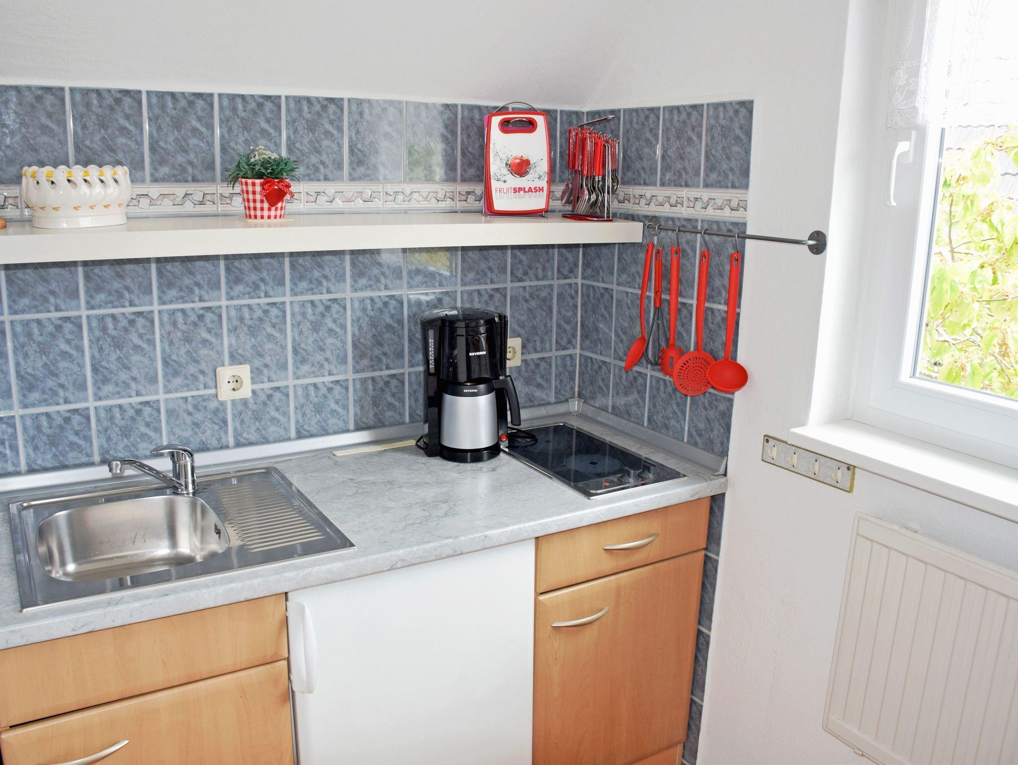 In der separaten Küche stehen ein kleiner Esstisch mit Stühlen und eine Küchenzeile. Die Küchenzeile ist mit einem Herd, Mikrowelle, Wasserkocher, Kaffeemaschine, Toaster, Spüle und Kühlschrank ausgestattet.