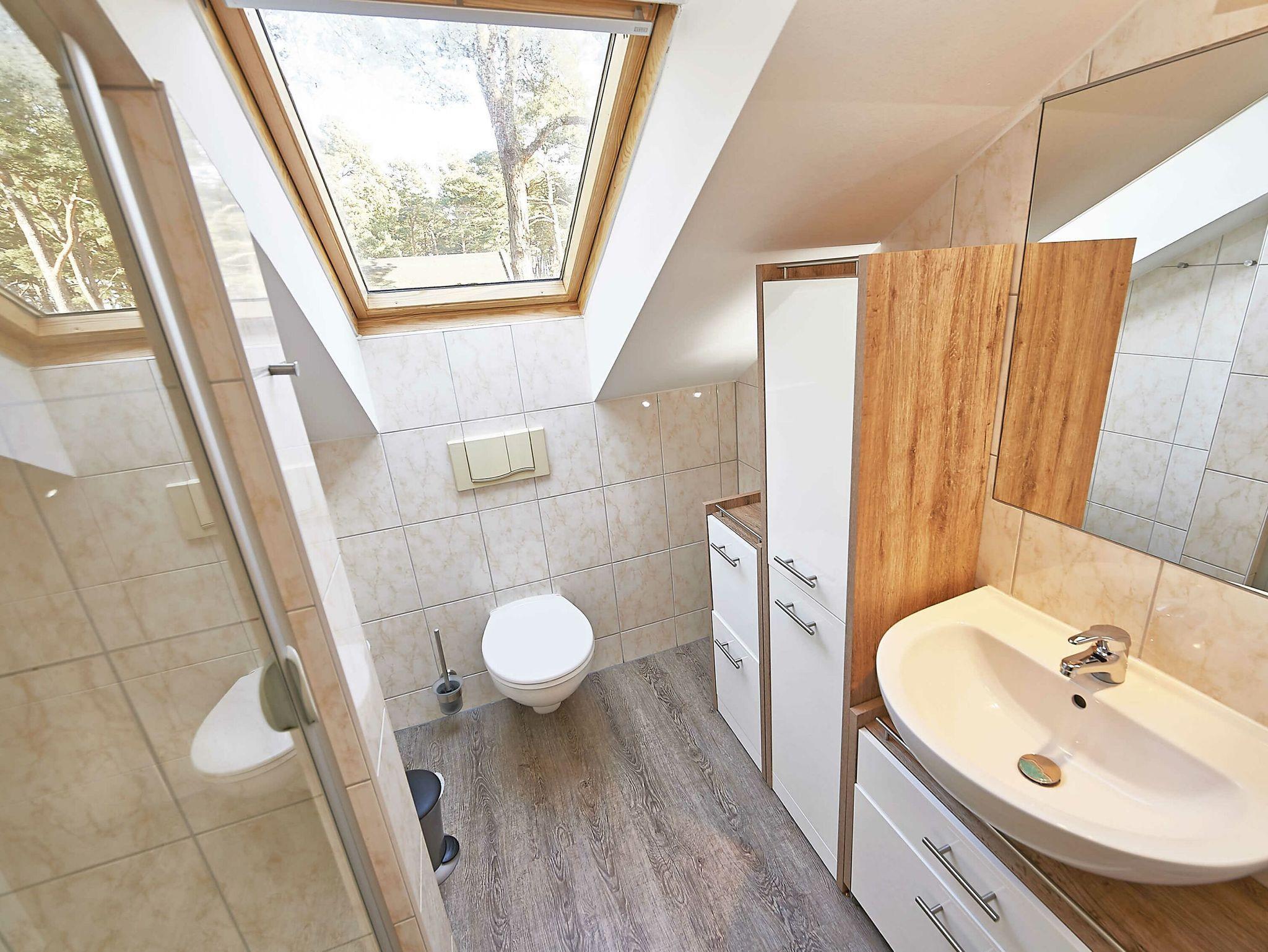 Im Obergeschoss mit überdachtem Balkon befinden sich unter gemütlichen Dachschrägen zwei weitere Schlafzimmer - das eine mit Doppelbett und das andere mit zwei Einzelbetten - sowie eine Schlafcouch (Aufbettungsmöglichkeit für zwei Personen) in der offenen Galerie. Auch ein kleines Bad mit Dusche/WC und Waschtisch gibt es hier.