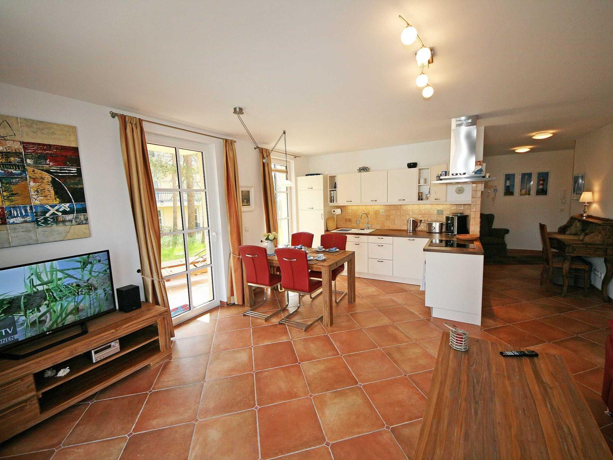 Komplett und hochwertig (vergleichbar 4 Sterne) ausgestattete Nichtraucherferienwohnung für 2 bis max. 3 Personen mit viel Liebe zum Detail eingerichtet. Die von den meisten Gästen als sehr gemütlich bezeichnete Wohnung ist ca. 67 qm groß, liegt Parterre und verfügt über eine große Eckterrasse, die nach Südosten ausgerichtet ist. Zwei Teakholzliegen und ein Ensemble mit einem Tisch und vier Stühlen runden den Aufenthalt draußen ab. In dem im mediterranen Stil erbaute Haus befinden sich nur vier weitere Wohneinheiten. Das Haus ist Bestandteil einer Ferienanlage, die mit einem kleinen Park direkt an den Strand von Baabe angrenzt. Die gesamte Wohnung mit Ausnahme des Bades (weiß und gelb) ist in einem warmen Terrakotta-Ton gefliest. Der Wohnbereich ist mit einem großen Ecksofa (zusätzliche Schlafgelegenheit für 3. Person, 1,20m x 2,00m) aus Leder, gebürsteten Teakholzmöbeln und einem großen Flachbildschirm (3D) eingerichtet. Bücherregale und ein Glasvitrinenschrank runden das Bild ab. Der große Holzesstisch lädt mit seinen vier sehr bequemen Lederstühle ein, auch nach dem Essen noch ein wenig sitzen zu bleiben, zumal dort ein Blick auf die Ostsee gegeben ist. Der direkt angrenzende Küchenbereich ist sehr vielseitig ausgestattet. Hier ist alles zu finden, damit das Kochen im Urlaub Spaß macht: Kühlschrank, Induktionsstromherd, Dunstabzugshaube, Spülmaschine, Toaster, Wasserkocher, Espressomaschine, Rührgerät etc. Vier Terrassentüren führen von der Wohnküche auf die Terrasse mit einem Blick auf die Ostsee durch lichte Baumkronen hindurch. In dem großzügigen Flur befindet sich neben der Garderobe ein Sekretär sowie eine gemütlicher Ohrensessel, um sich auch einmal zurückziehen zu können. Dort schließt sich eine Kammer an, in der Bügeleisen, Liegenauflagen, Stuhlkissen für außen, ein Wäschegestellt, Besen etc. zu finden sind und die auch Platz für Ihre Koffer hat. Das helle Bad verfügt über eine ebenerdige Dusche, ein WC, ein großes Waschbecken, ein Bidet sowie einen Fön. Attraktiv wird das Bad zusätzlich durch den großzügigen Wandspiegel. Das Schlafzimmer ist mit einem Doppelbett (1,80m x 2,00m), einem geräumigen Kleiderschrank und Nachttischkästen in Kiefer hell, freundlich und vor allem zweckmäßig eingerichtet. Gegenüber von dem Bett ist ein kleiner Flachbildschirm angebracht. Die Terrassentür im Schlafzimmer kann mit Vorhängen verdunkelt werden. Während Ihres Aufenthaltes steht Ihnen die Nutzung des Internets (WLAN) inklusive zur Verfügung. Zur Wohnung gehört ein Stellplatz in der Tiefgarage (Nr. 93, Einfahrtshöhe 2,00m) und die kostenlose Nutzung des Wellnessbereiches mit verschiedenen Saunen und einem kleinen Indoor-Schwimmbecken, so dass auch bei kühleren Tagen das Urlaubsgefühl erhalten bleiben kann. Haustiere sind leider in unserer Wohnung nicht erlaubt. Im Keller des Hauses haben Sie die Möglichkeit eine Waschmaschine/Trockner gegen Gebühr zu nutzen. Mit dem Fahrstuhl des Hauses A gelangen sie in das Untergeschoss der Meeresblickanlage, wo Sie ein großzügiger und heller Wellnessbereich erwartet. Hier können sie in einem Pool kleine Bahnen schwimmen, in 2 Saunen Ihren Kreislauf in Schwung bringen, in einem dazugehörigen Ruheraum Ihren Körper wieder beruhigen, in einer Schneckendusche sowie weiteren Duschen das kühle Nass genießen und auf einer Außenterrasse mit Außendusche die frische Luft einatmen. Die Erstausstattung eines Wäschepaketes (komplette Bettwäsche, 1 Duschhandtuch, 2 kleine Handtücher) können Sie bis 14 Tage vor Anreise gegen einen Aufpreis dazu buchen oder durch eigene ergänzen. Ab 2 gebuchten Paketen erhalten Sie einmalig 1 Geschirrhandtuch und 1 Duschvorleger hinzu.