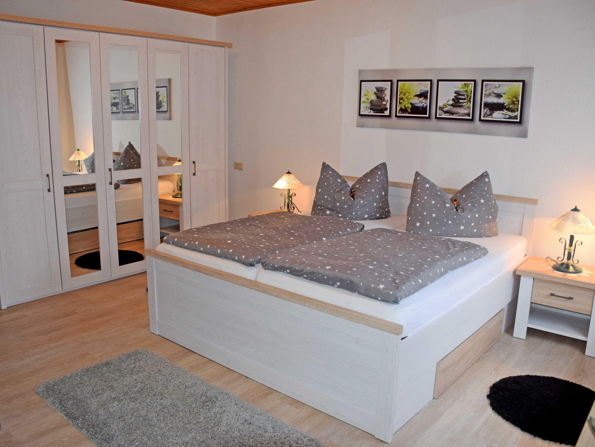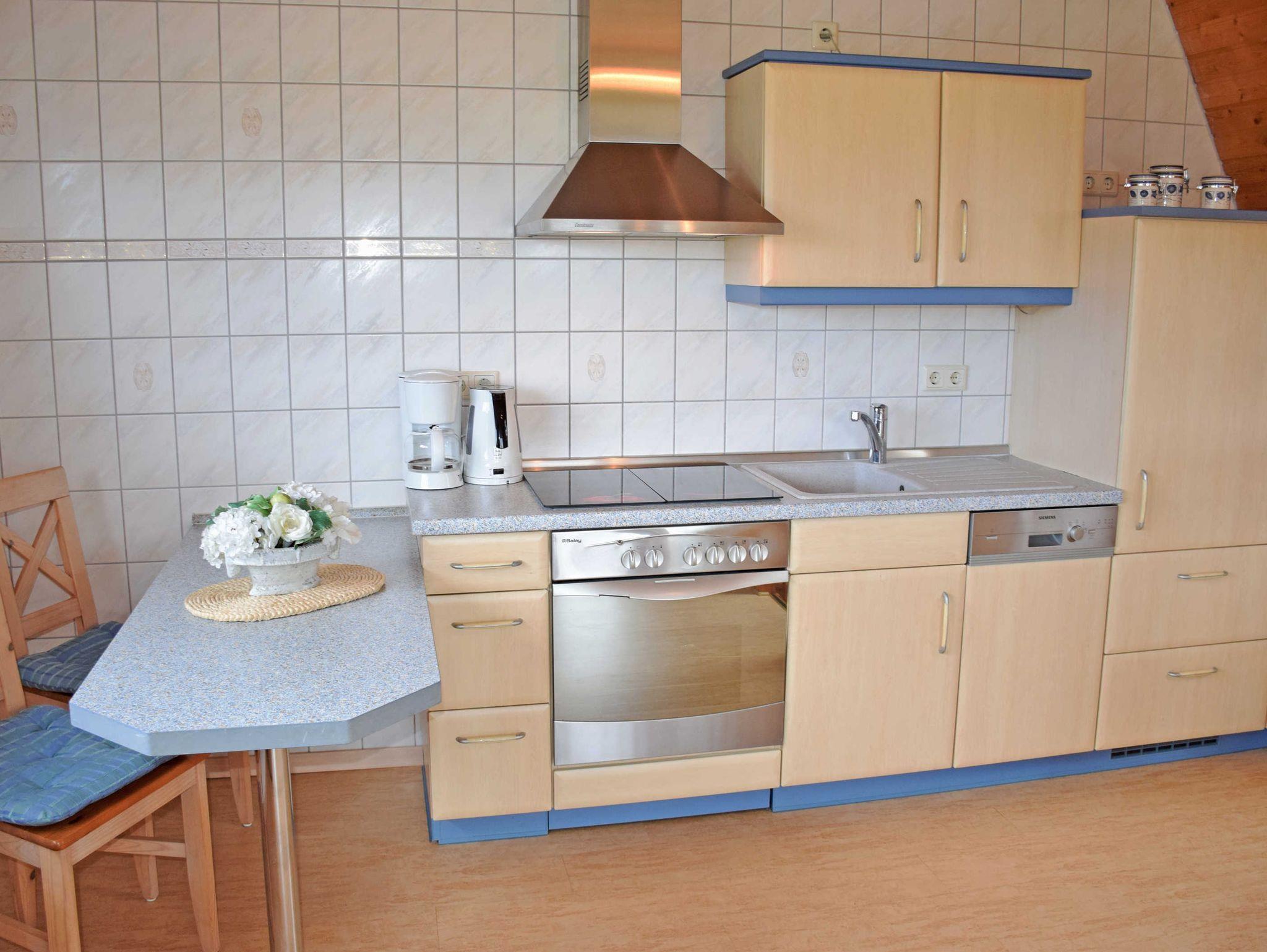 Die moderne Küchenzeile ist mit einem Herd, Abzugshaube, Backofen, Geschirrspüler, Minigrill, Wasserkocher, Kaffeemaschine, Toaster und Kühlschrank komplett ausgestattet. Das im Erdgeschoss liegende großzügige Schlafzimmer ist mit einem bequemen Doppelbett mit Nachtschränken und Leselampen sowie einem Kleiderschrank ausgestattet. Hier befinden sich auch eine Komode und ein Ankleidespiegel. Bei Ihrer Anreise liegen für Sie frische Handtücher bereit und die Betten sind selbstverständlich bereits mit Bettwäsche aufbezogen. Ein Wäschepaket (Wechsel) kann gegen eine Gebühr von 15 je Gast hinzugebucht werden.