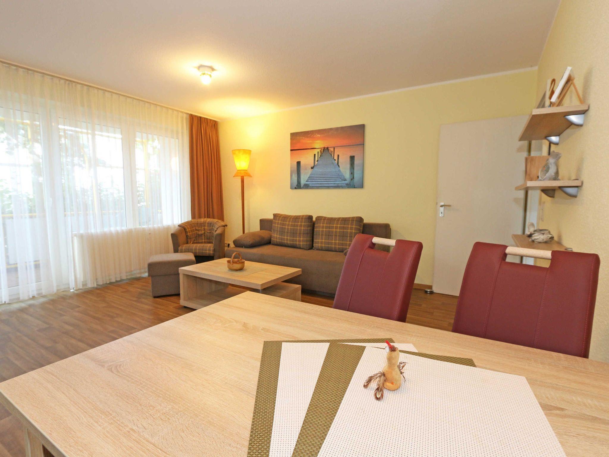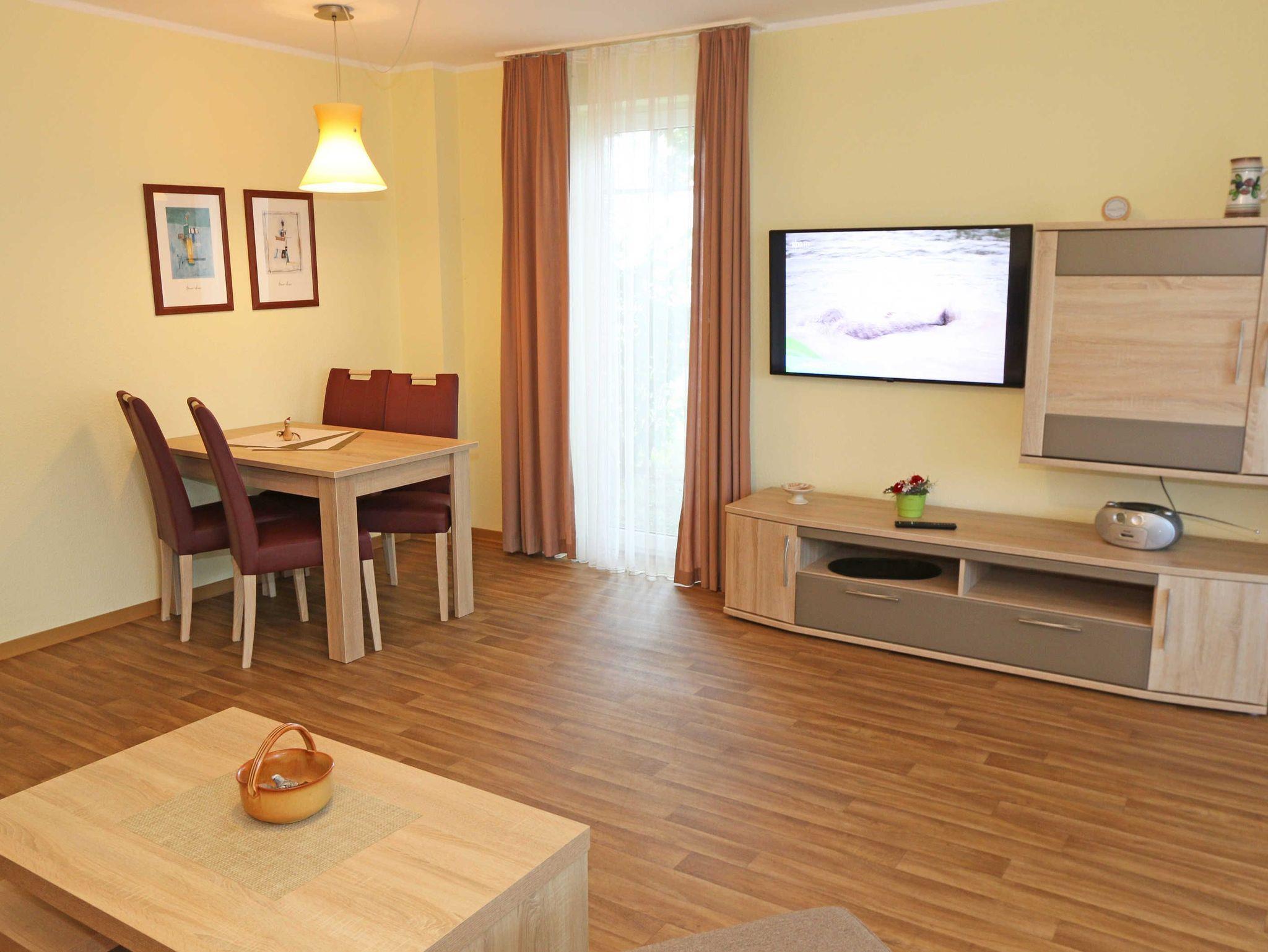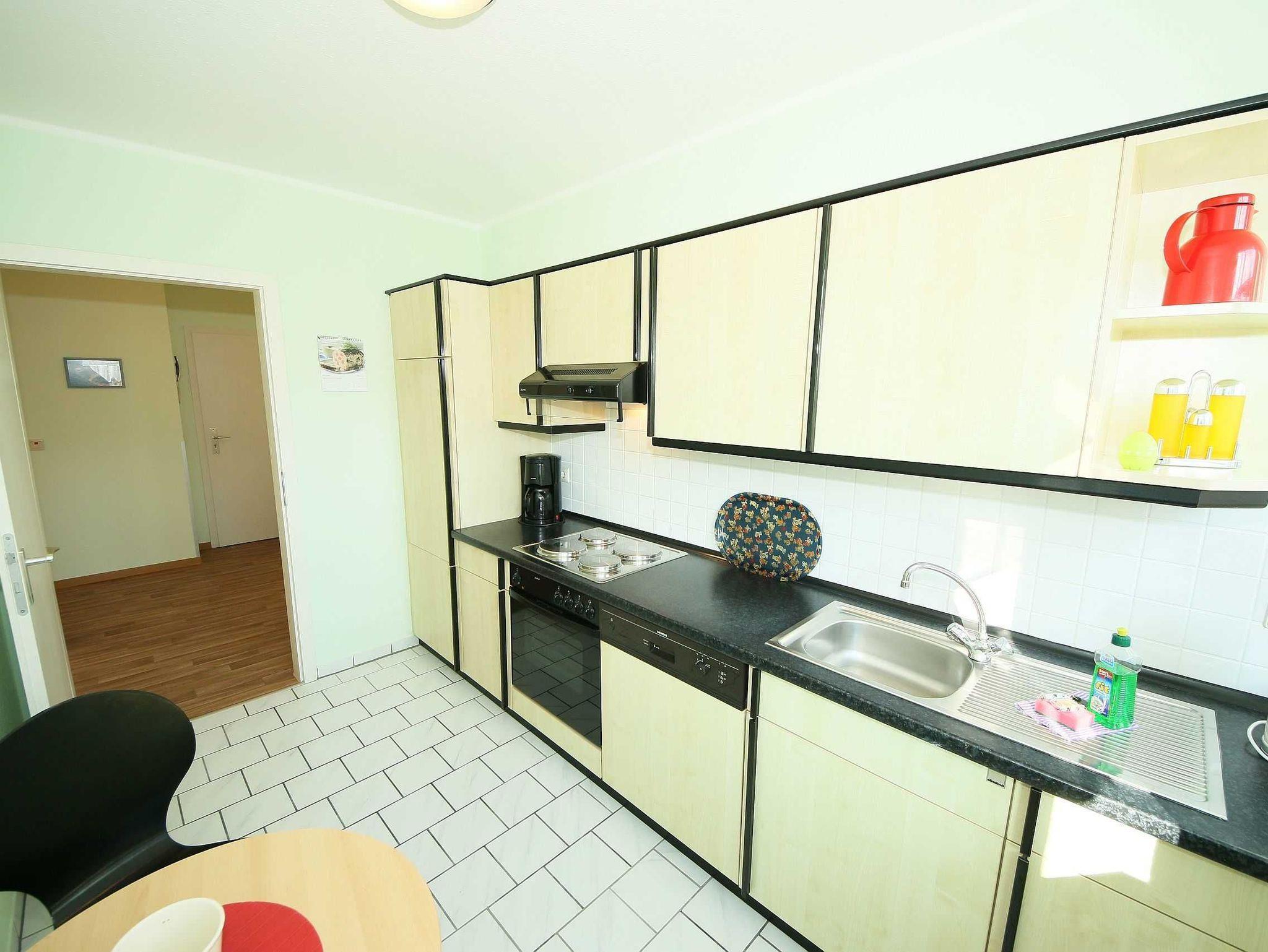 Die Ferienwohnung ist eine lichtdurchflutete und geräumige ca. 60qm große 2-Zimmer-Nichtraucherwohnung für max. 2 bis 4 Personen. Der aus dem Wohnzimmer zu erreichende überdachte Südwestbalkon lädt zu jeder Tageszeit zum Verweilen ein. Das Wohnzimmer ist ausgestattet mit einer Couch (Aufbettung für 3./4. Person/ 1,50m x 2,00m) Couchtisch sowie einen gesonderten Esstisch für 4 Personen. Ein Smart-TV und ein Radio mit CD-Player, eine Leselampe sowie ein inklusiver WLAN-Anschluss runden die gemütliche Ausstattung ab. Im Schlafzimmer befinden sich ein Doppelbett (1,80m x1,90m) mit Nachttischkonsolen, Flachbild-TV, ein geräumiger Kleiderschrank, ein großer Wandspiegel sowie ein Herrendiener mit Sitzmöglichkeit. Die separate Küche ist komplett mit Cerankochfeld, Backofen, Spülmaschine, Kühlschrank mit Eisfach, Ablufthaube, Mikrowelle, Wasserkocher, Kaffeemaschine, Toaster und einer Sitzecke für 2 Personen ausgestattet. Das geflieste Bad wird durch eine Dusche, WC, Waschtisch, Kosmetikspiegel und ein mobiler Wäschetrockner abgerundet. Insektenschutzgitter befinden sich im Küchen- und Schlafbereich. Eine Waschmaschine und ein Trockner (Münzbetrieb) sind im Keller nutzbar. Auch können Sie hier einen Fahrrad - und Kinderwagenabstellraum nutzen. Ein eigener PKW-Stellplatz (Nr.13) gehört zur Wohnung dazu. 1 Haustier ist gegen eine Gebühr ein gern gesehener Gast. Die Erstausstattung eines Wäschepaketes (komplette Bettwäsche, 1 Duschhandtuch, 1 kleines Handtuch) können Sie bis 14 Tage vor Anreise gegen einen Aufpreis dazu buchen oder durch eigene ergänzen. Ab 2 gebuchten Paketen erhalten Sie einmalig 1 Geschirrhandtuch und 1 Duschvorleger hinzu.