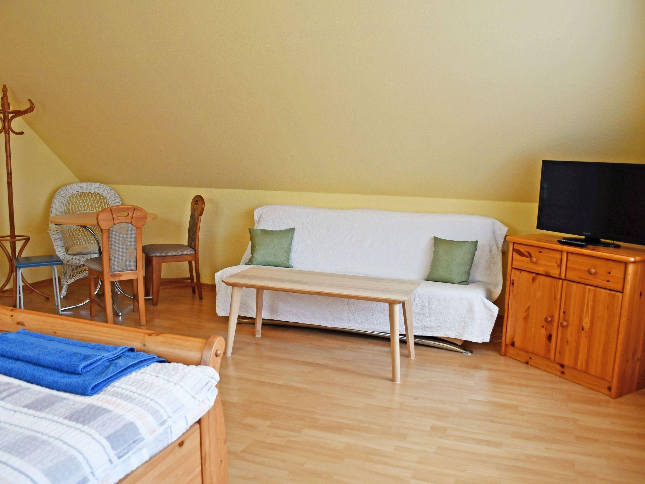 Im dem hell und freundlich kombinierten, großzügigen Wohn-/Schlafraum befinden sich eine Schlafcouch, ein TV-Gerät und eine Musikanlage sowie ein Kleiderschrank. Hier befindet sich auch ein bequemes Doppelbett mit Nachttischen und Leselampen. Bei Bedarf kann die Schlafcouch auch für einen dritten Gast aufgebettet werden.