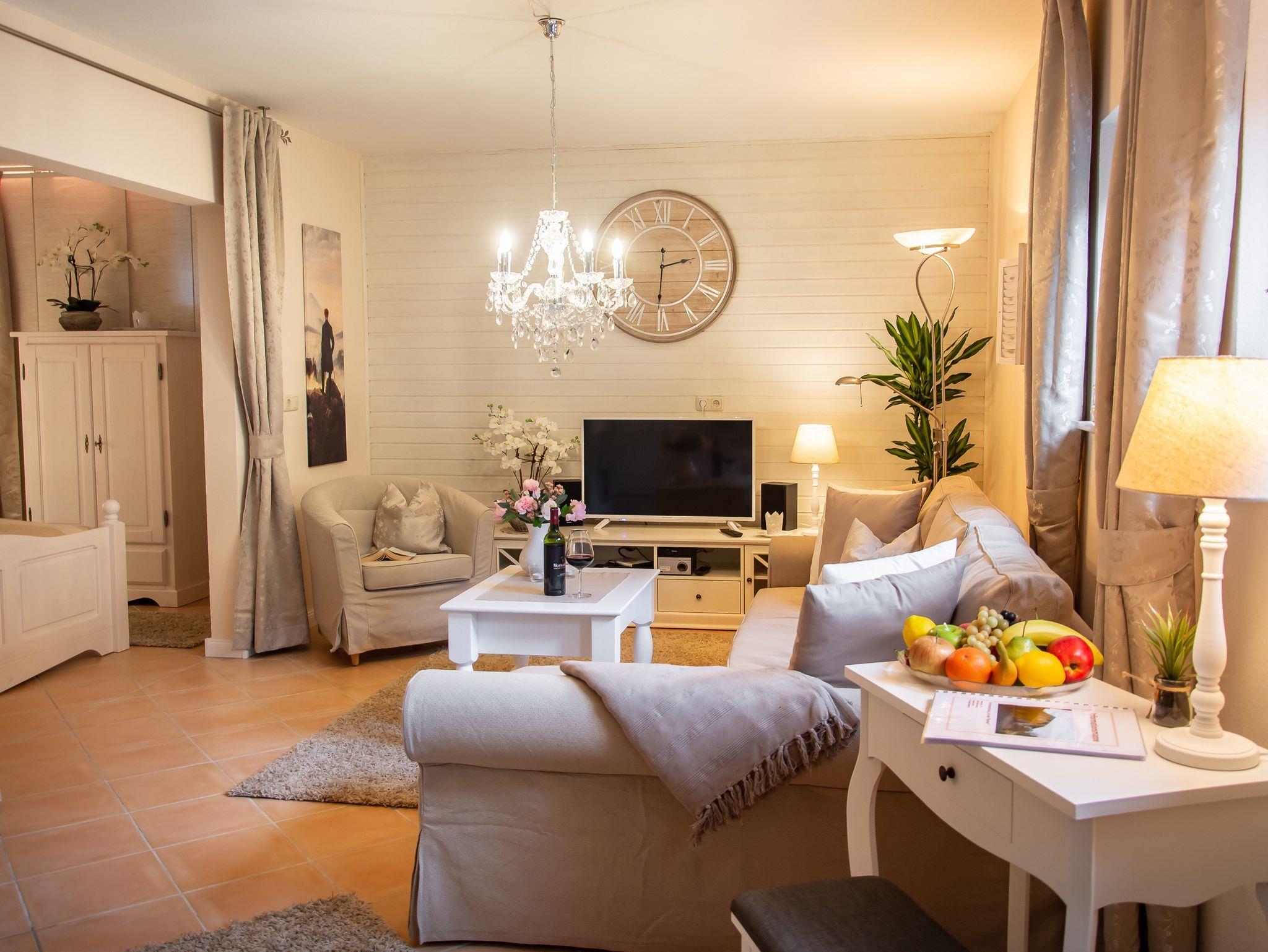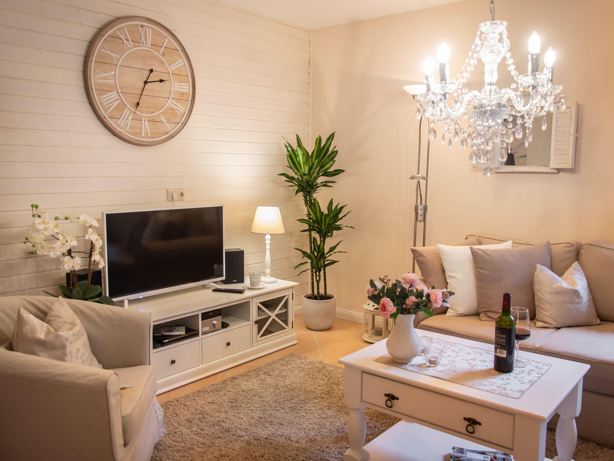 Die helle, gemütliche und geschmackvoll eingerichtete Wohnung betritt man direkt über die komplett ausgestattete Küche. Hier finden Sie eine Einbauküche mit Backofen, Mikrowelle, Ceran-Kochfeld mit Dunstabzug, Kühl-/Gefrierschrank und Geschirrspüler. In der Küche lädt eine kleine Sitzgruppe zum Frühstücken oder Essen ein. Kaffeemaschine, Kaffee-Vollautomat, Wasserkocher, Toaster und Handrührgerät runden die Ausstattung ab. Von der Küche geht es in das großzügige Wohnzimmer mit Schlafcouch, separater Leseecke und einem kleinen Schreibtisch. Damit keine Langeweile aufkommt, sind Bücher, Gessellschaftsspiele, ein Flachbildfernseher, ein DVD-Player sowie eine Stereoanlage vorhanden. Durch die drei Fenster des Wohnzimmers hat man einen Blick auf die zur Wohnung gehörige Terrasse. Das angrenzende Schlafzimmer mit großem Doppelbett ist zum Wohnzimmer teilweise offen, kann aber durch einen Vorhang abgetrennt werden. Durch einen kleinen Flur betritt man das Bad mit Fenster, welches über eine Dusche verfügt. Fön, Handtücher und diverse Hygieneartikel sind vorhanden. Zur Wohnung gehört eine eigene Terrasse mit Sitzgruppe und Liege, welche ausschließlich zur Ferienwohnung gehört. Hier gibt es auch einen Gasgrill zur exklusiven Nutzung. Ebenfalls finden Sie hier ein kleines Gartenhaus, in welchem sich unter Anderem zwei Fahrräder befinden, die während des Aufenthaltes kostenlos von unseren Gästen genutzt werden können. Die Wohnung ist nur über Stufen erreichbar und deshalb nicht behindertengerecht.