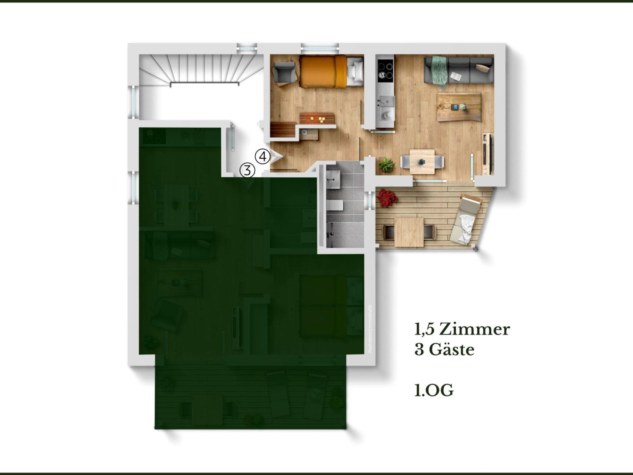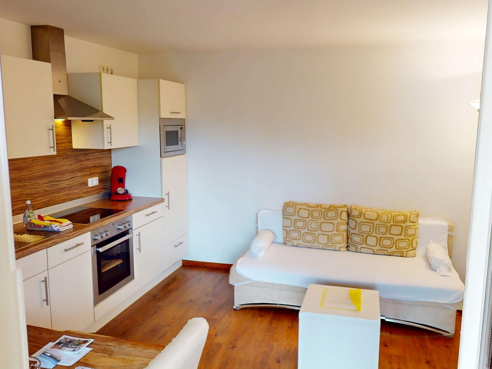 Diese komplett möblierte 1,5-Zimmer-Ferienwohnung bietet Platz für bis zu 3 Gäste mit zwei getrennten Schlafbereichen.
