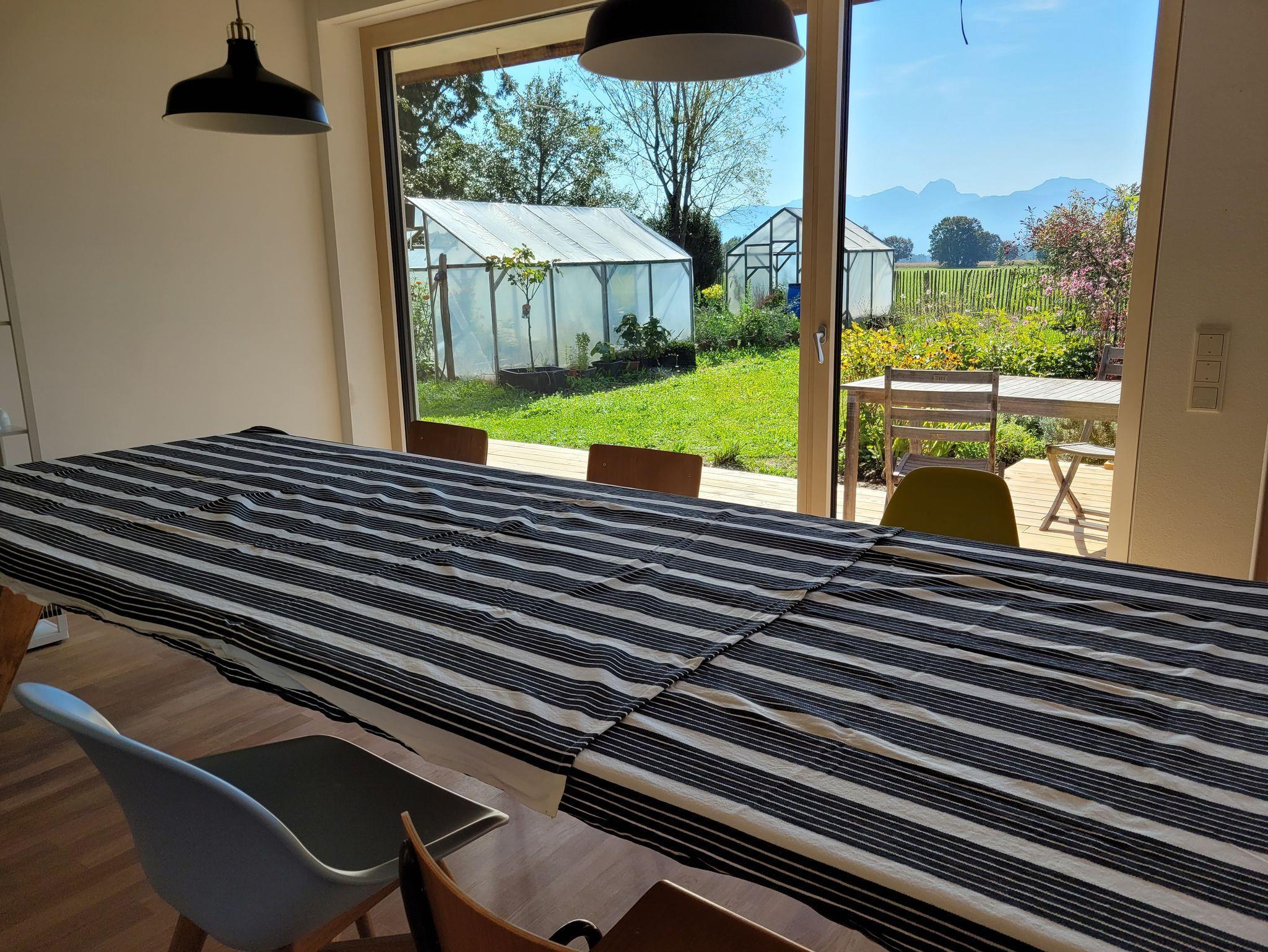 Wer mit dem Auto anreist, kann sein Fahrzeug für die gesamte Zeit des Aufenthalts direkt vor dem Garten in einer Parkbucht am Gartenzaun parken. Für Fahrräder, Skier oder andere Sportgeräte ist im Carport eine offen zugängliche Unterstellmöglichkeit gegeben (nicht absperrbar). Man betritt die Ferienwohnung im Erdgeschoss über einen gemeinsam genutzten Hauseingang und gelangt zur rechten in den Flur mit Garderobe und Sitzbank. Von dort geht zum einen das Badezimmer mit Dusche, Waschbecken und Toilette ab. Zum anderen öffnet sich hinter einer zweiflügeligen Glastür das Herzstück der Wohnung: eine große Wohnküche, die der Länge nach verglast ist und einen freien Blick auf den Garten und die dahinter liegende Landschaft freigibt. Die voll ausgestattete Wohnküche hat auf der rechten Seite eine Küchenzeile und einen Stehtisch, an dem sich Kochen und Essen lässt. Daneben befinden sich Sitzstufen aus Holz an der Wand, wo man gemütlich einen Kaffee trinken oder lesen kann. Im Zentrum der Wohnküche steht ein (wirklich) sehr großer Holztisch, der schon einige Gebrauchsspuren aufweist und an dem viele Personen Platz haben. Seine Besonderheit: in der Mitte sind hinter Klappen Steckdosen und LAN-Anschlüsse versteckt, falls man arbeiten oder einfach nur ins Internet gehen möchte. Wer es gemütlicher haben möchte, kann den Tisch mit verschiedenen Tischdecken dekorieren. Über einen Wandflur - mit Sprossenwand und Platz für Yogaübungen, einer Sitzecke mit Lesesessel und Buchregal - gelangt man links zum Schlafzimmer mit Kleiderschrank, Schminktischchen und französischem Bett. Zur rechten schließt sich das Wohnzimmer mit einem großen Loungesofa an, ebenfalls mit einer durchgängigen Glasfront und Zugang zu Terrasse und Garten. Hier befindet sich auch der Beamer und die Soundanlage, mit denen sich Filme auf die freie weiße Wand projizieren lassen. Das Loungesofa lässt sich für zwei weitere Personen zu einem Gästebett umfunktionieren, die Bettwäsche dazu befindet sich im selben Raum in zwei großen Aluminiumkisten, die auch als Ablage genutzt werden können. Auf Anfrage kann sowohl die Waschmaschine als auch ein Trockner im Obergeschoss mitbenutzt werden als auch die Feuerschale im Garten.