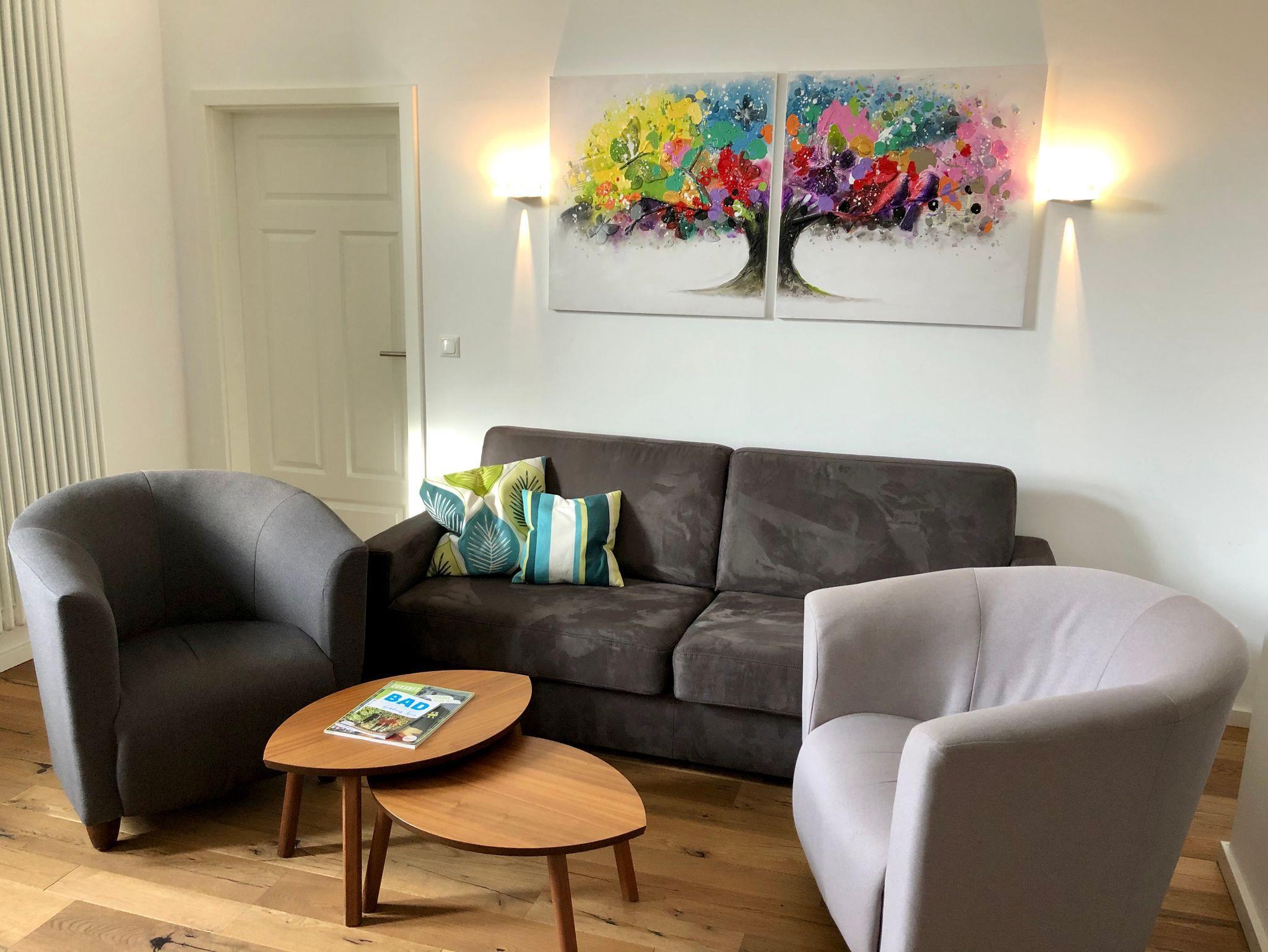 Ein hochwertiger Eichen Parkettfußboden, stilvolles Mobiliar und ein Flachbild-Fernseher mit Kabelanschluss runden das Angebot ab.