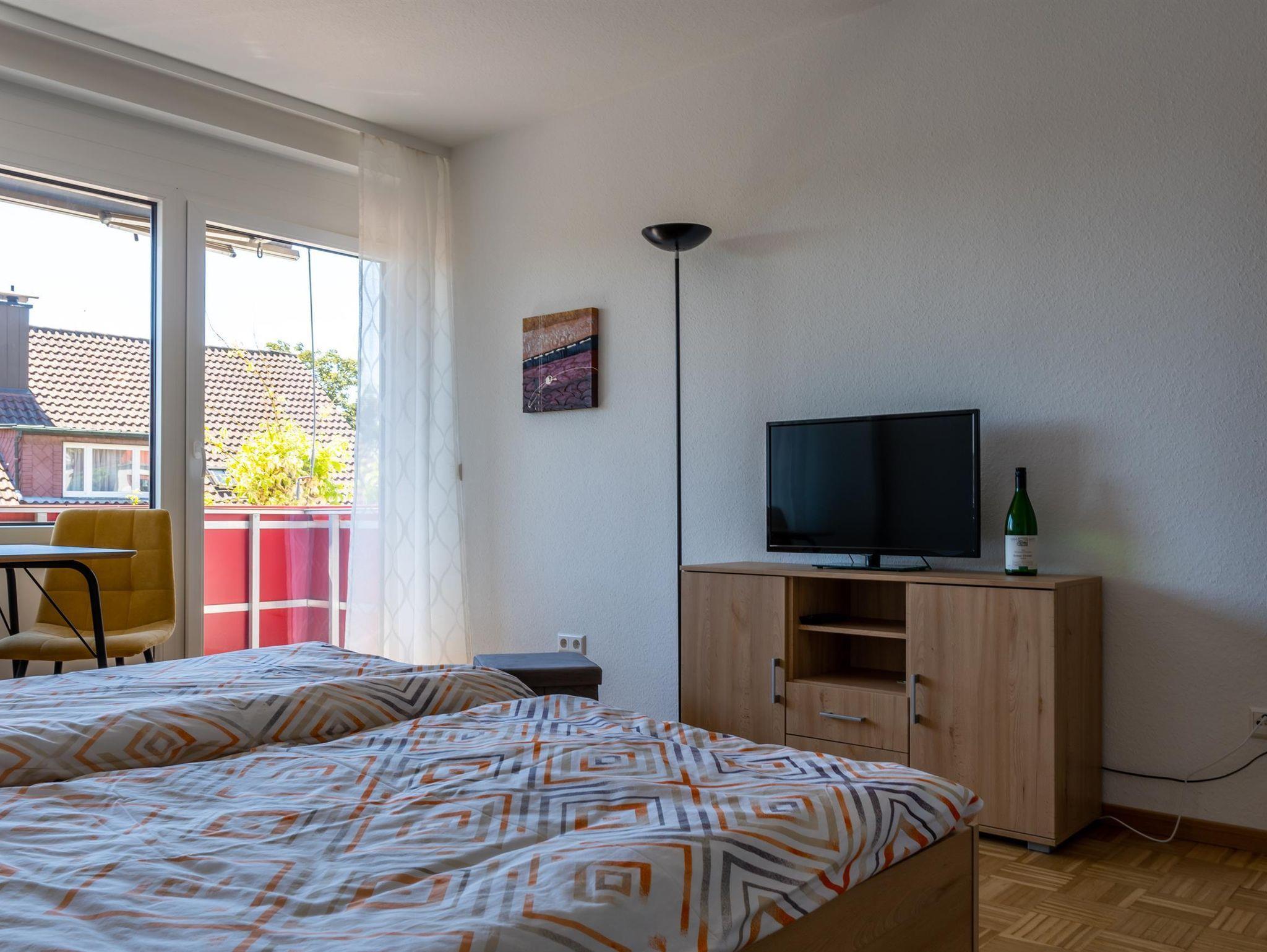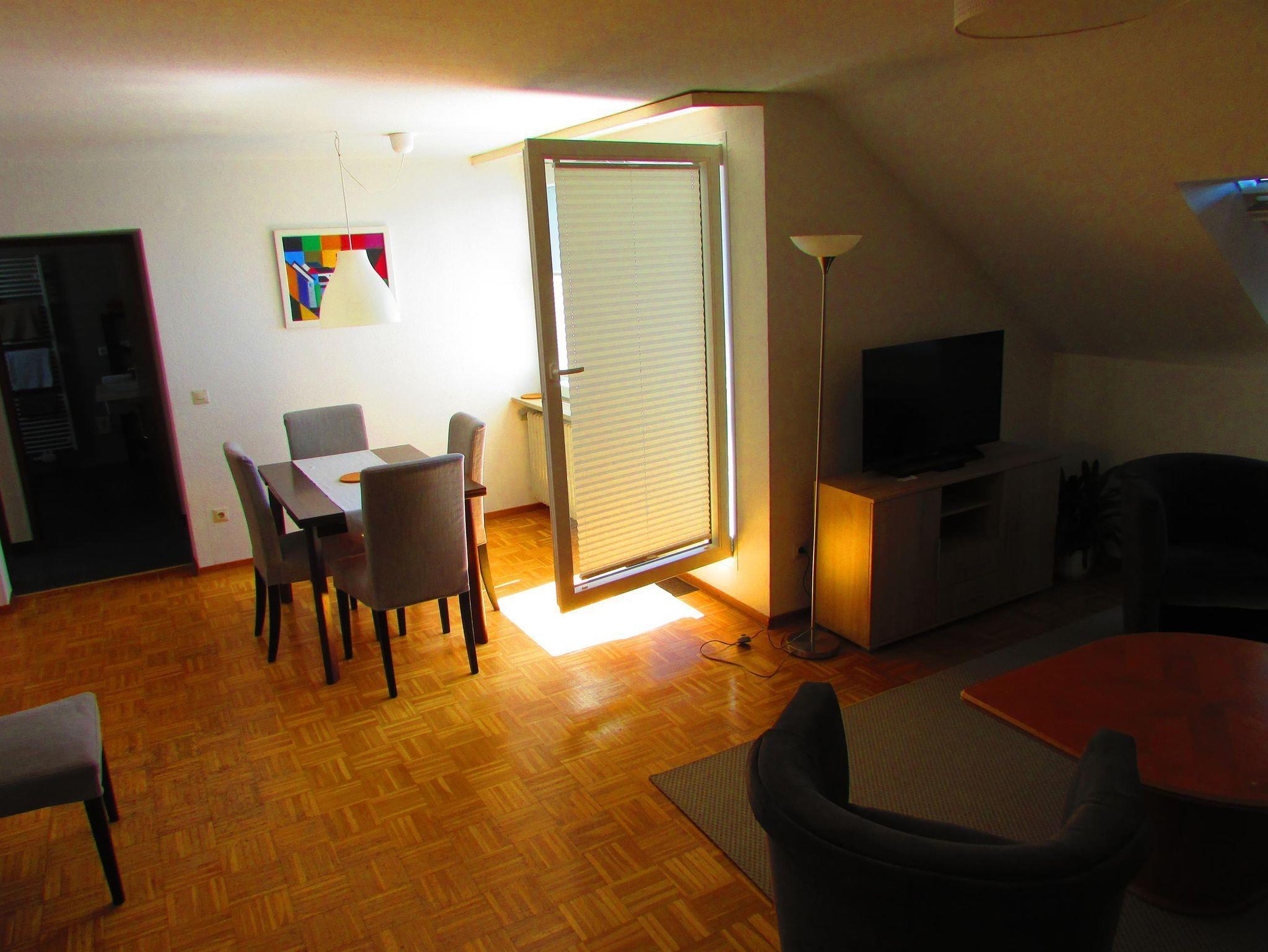 Großzügiges helles Appartement (Wohn/Schlafraum) mit eingerichteter seperaten Küche, TV, WLAN, Dusche/WC, Südbalkon mit Sitzmöbeln, Bettwäsche, Hand- und Badetücher vorhanden. Kostenfreie Parkplätze vor dem Haus.