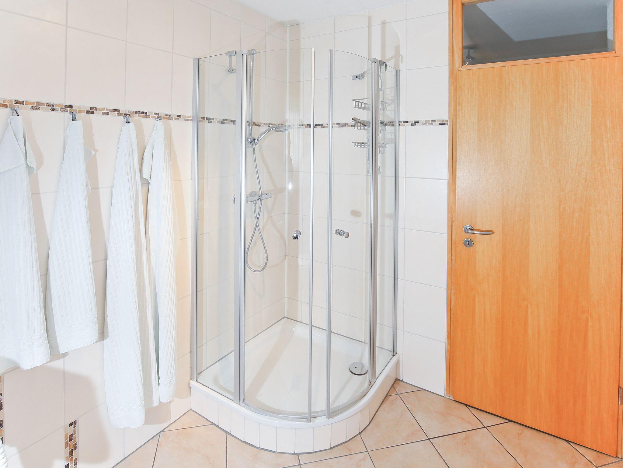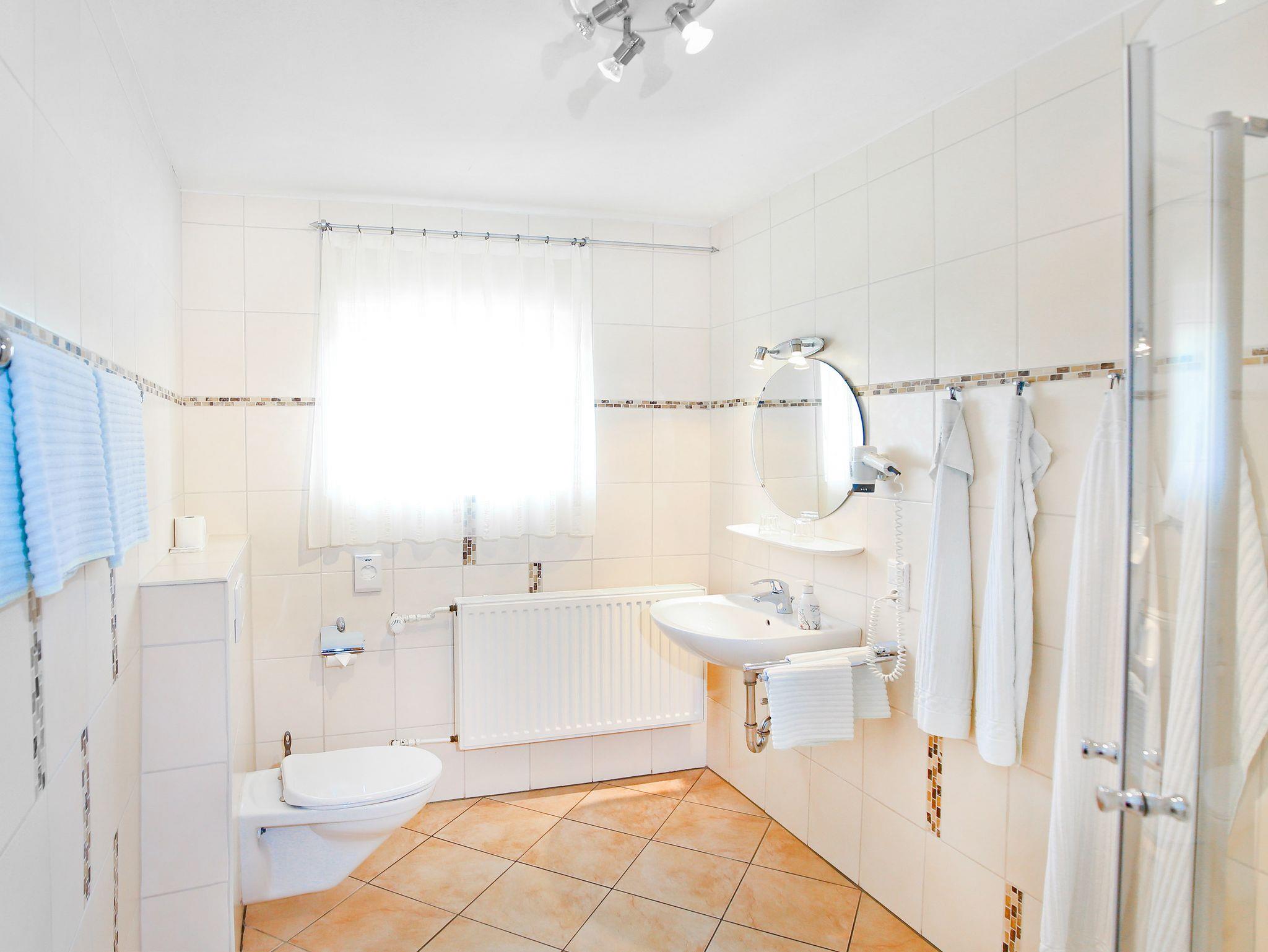 Das helle Badezimmer inklusive Dusche macht das „Schwalbennest“ vollkommen zur perfekten Übergangsheimat für unsere Gäste.