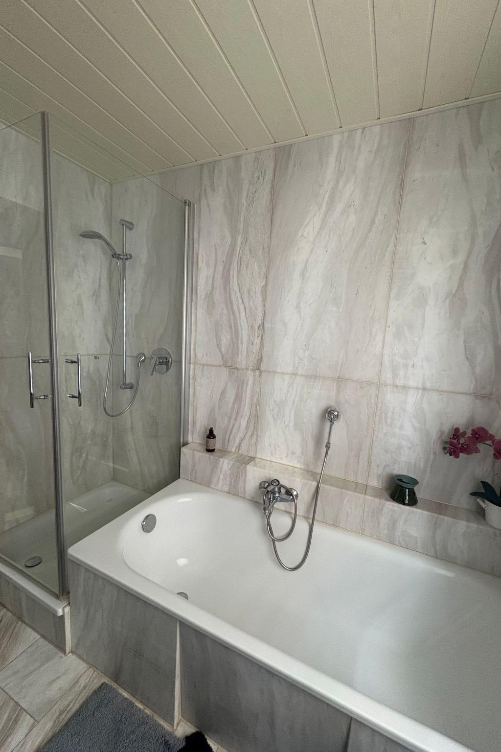 Das Badezimmer bietet eine Dusche und eine Badewanne. Es gibt genügend Handtücher und wenn Sie anreisen ist alles vorbereitet. Die Betten sind frisch überzogen.