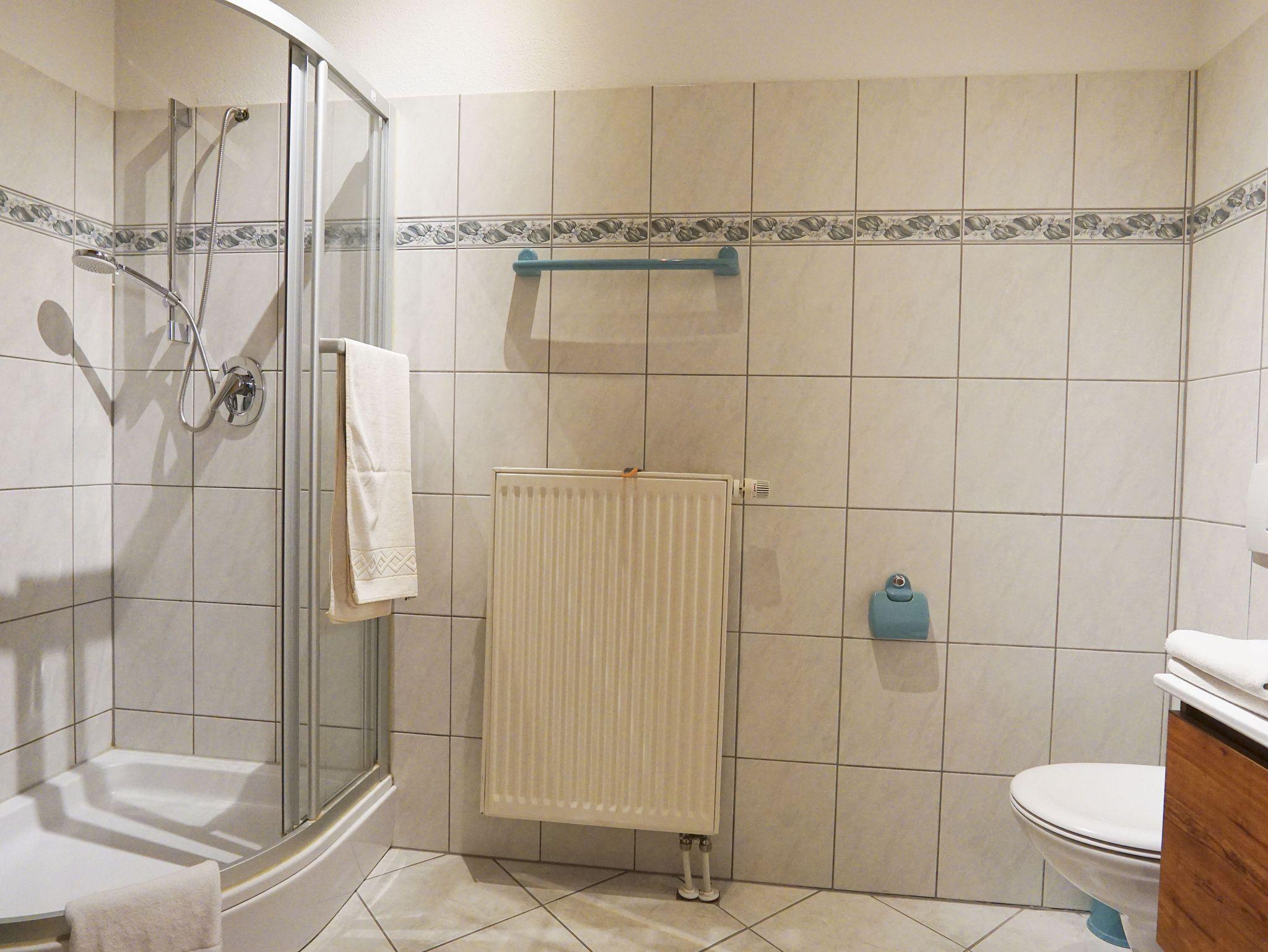 Das Bad ist ausgestattet mit WC, Dusche, Föhn und Handtücher.