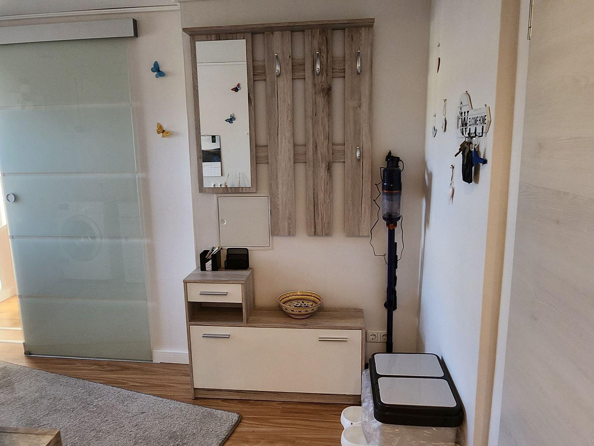 Zu der Wohnung gehört ein umfriedeter Stellplatz auf dem Hof. Die Einrichtung und Geräte sind größtenteils neu. Die Wohnung wurde 2021 kernsaniert und ist nun fast Barrierefrei. Nur der Zugang zum Haus und zur Terrasse hat eine kleine Stufe ca. 8 cm und zur Küche ist ein kleiner Absatz von ca. 2 cm.