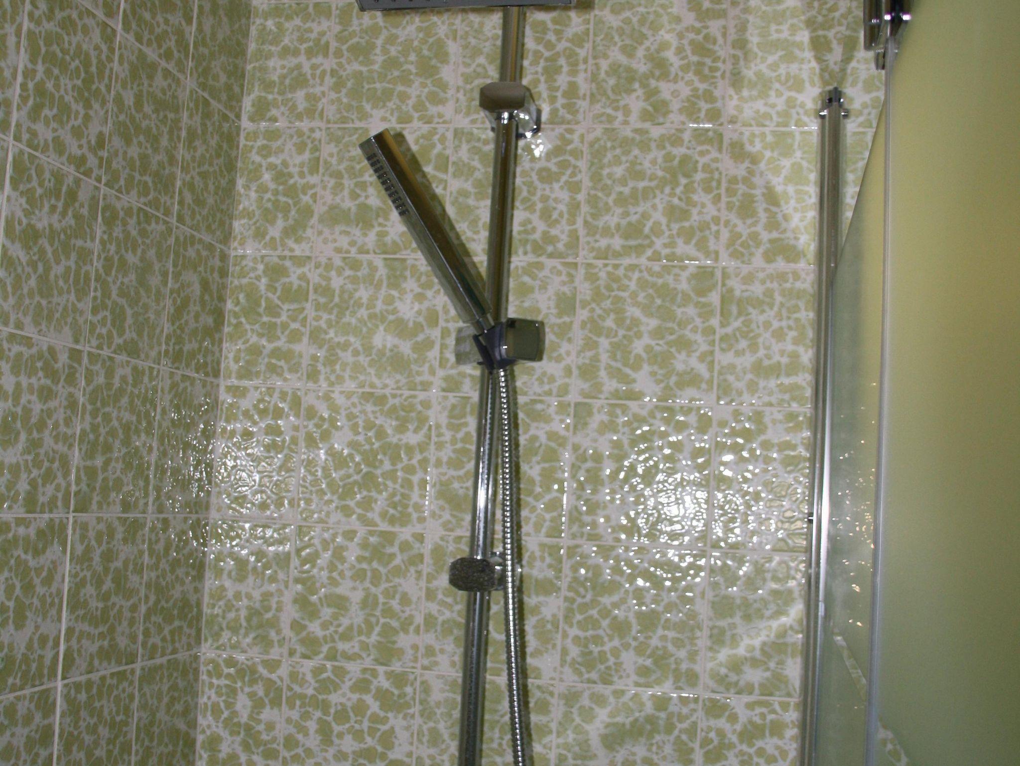 * Bad mit Charme der Siebzigerjahre: Badewanne mit Regendusche, Waschbecken, Badschrank, Toilette