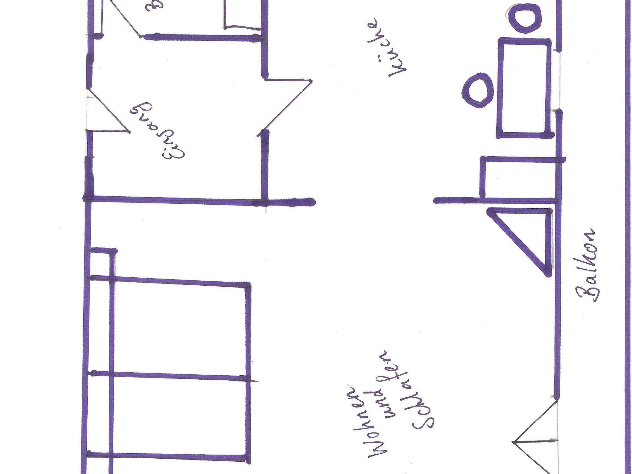 Couch, TV mit DVD player, Wohn-Küche mit Essecke, Dusche und WC und großer Südbalkon.