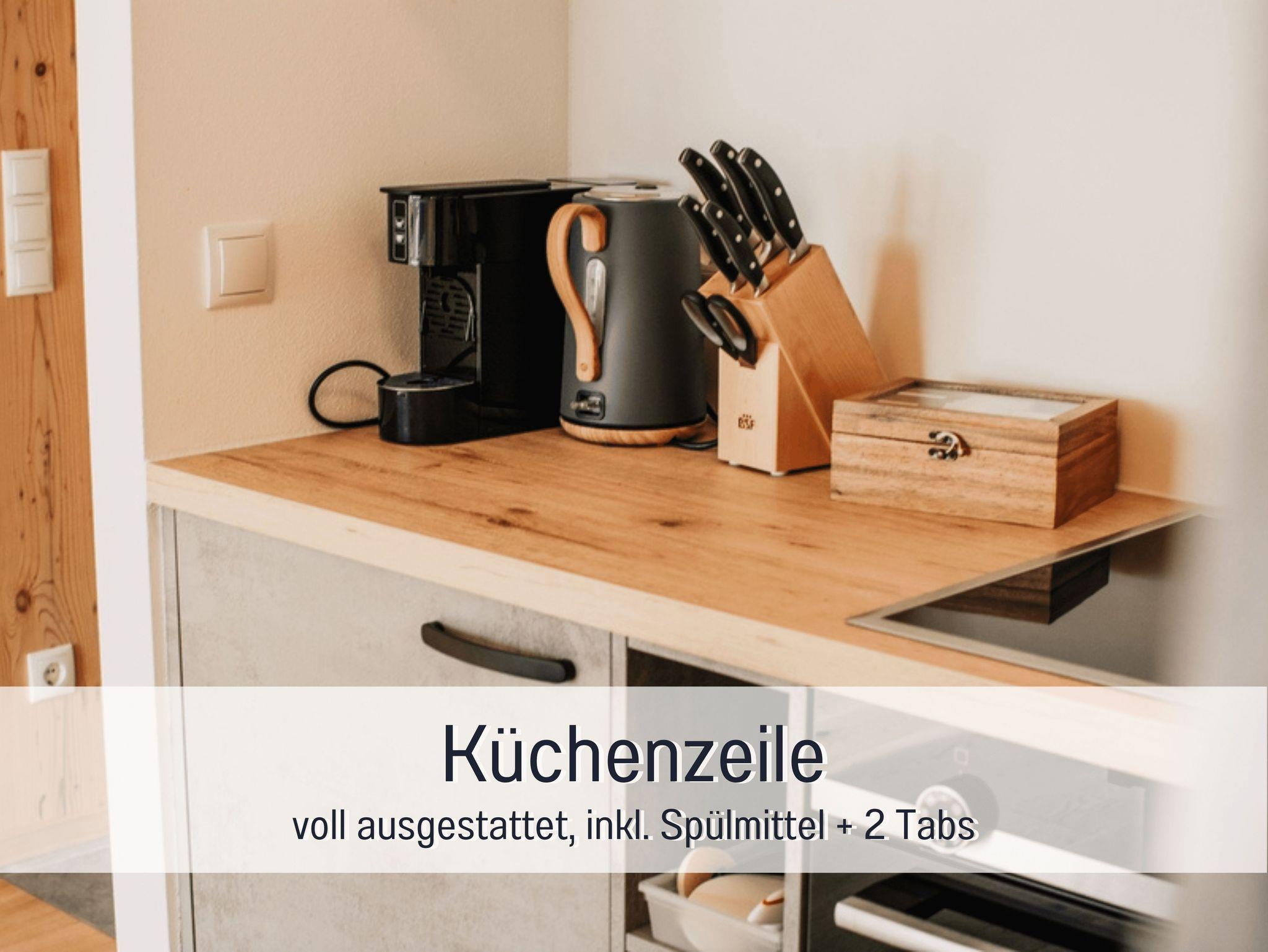 • vollausgestattete, moderne Küchenzeile, Esstisch und Couch