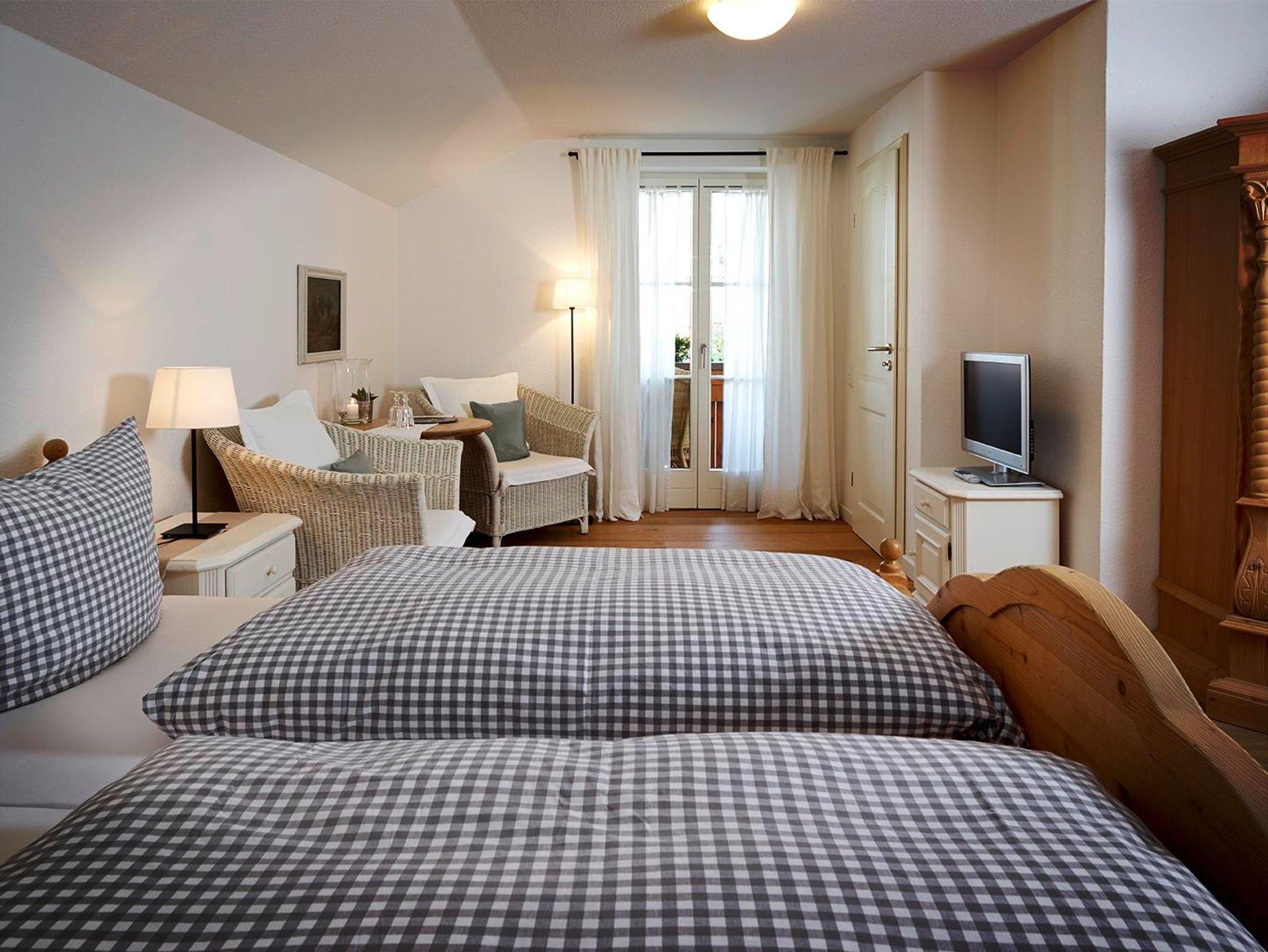 Geschmackvoll eingerichtetes Doppelzimmer (26qm) mit Dusche / WC, TV und WLAN. Balkon mit Aussicht auf den Hirschberg. Bitte beachten Sie, dass das Appartement keine Küche hat (kleiner Kühlschrank und eine Nespressomaschiene sind im Zimmer) und wir keinen Frühstücksservice mehr anbieten.