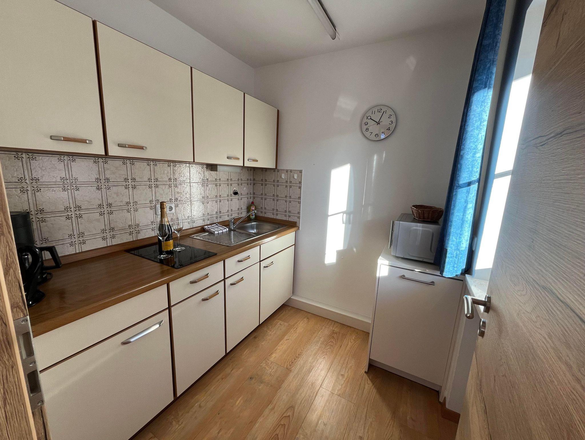 Alles neu renoviert ! Geeignet für 2-3 Personen (3 Person in Zustellbett). Lage: Südseitig, Hausmitte m.grossem überdachtem Balkon, grosses Wohn-/Schlafzimmer mit Doppelbett, Eckbank mit Tisch, komplette Küche mit Dunstabzug, Spülmasch. und Kühlschrank mit Gefriermöglichkeit, Bad-Dusche u. WC. Radio und Flachbildschirm-Sat-TV. Kinderbett auf Anfrage. Gesamt ca. 37 qm.
