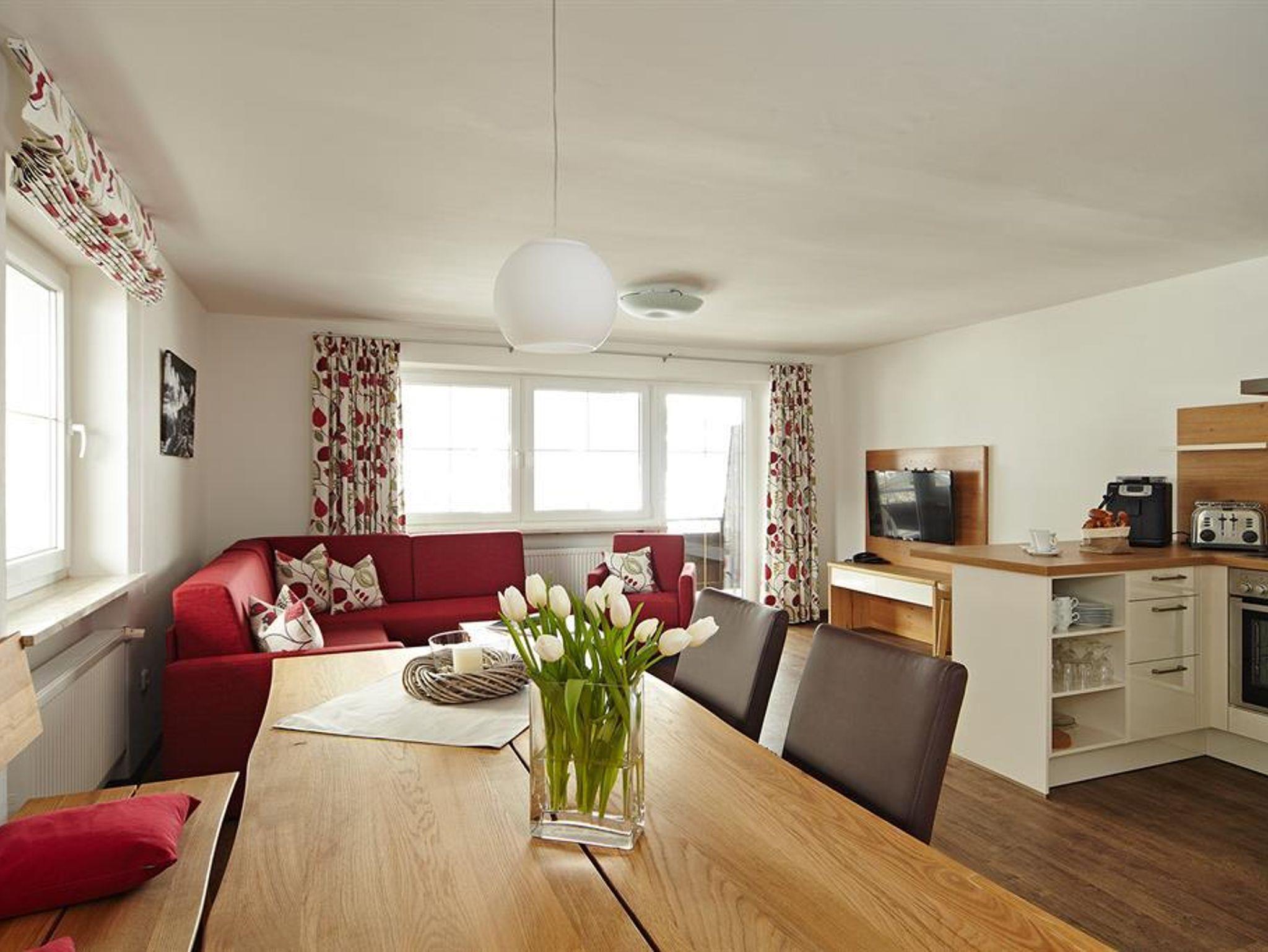 Großzügiger Wohn- und Essbereich, offene Küche mit Kaffeemaschine, Geschirrspüler und Backofen, zwei separate Schlafräume mit Doppelbetten und TV (1 x zusätzliche Schlafcouch) 2 Bäder mit Dusche und WC, Süd.- und Ostbalkon mit freiem Bergblick.