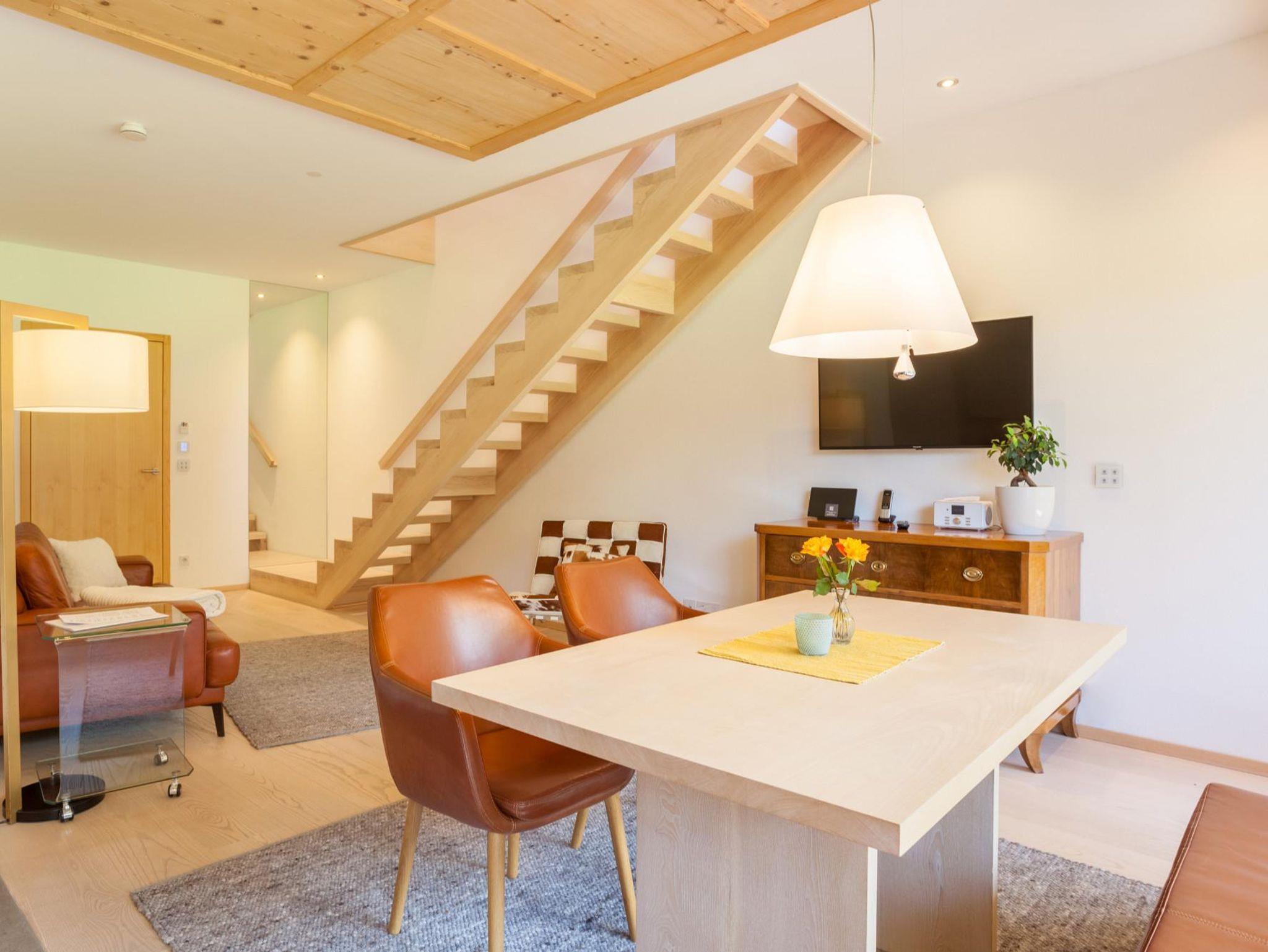 Unsere 70qm große Maisonette Wohnung auf 2 Etagen mit überdachten Südbalkonen lädt Sie zum Sonnenbaden ein. Im Erdgeschoss befindet sich eine offene Wohnküche, das Wohnzimmer und eine separate Toilette. Über eine Treppe gelangen Sie in Ihr großzügiges Schlafzimmer und ins Badezimmer. Von Ihrem hochwertigem Boxspringbett von180x200cm haben Sie einen schönen Blick in die Natur. Bei Anreise ist der Kühlschrank einmalig für Sie mit Butter, Milch, Käse, Honig, Eier, Brot und Alpschinken gefüllt.