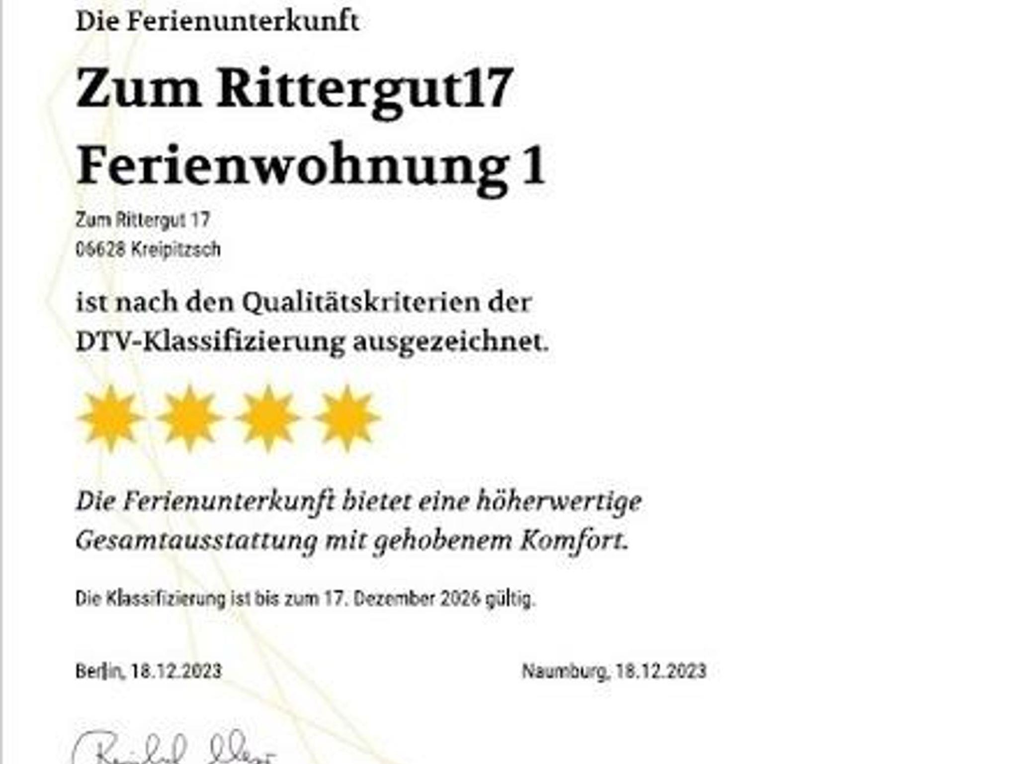 Die Ferienwohnung wurde im Dezember 2023 vom Deutschen Tourismusverband mit vier Sternen nach den Qualitätskriterien der DTV-Klassifizierung ausgezeichnet.