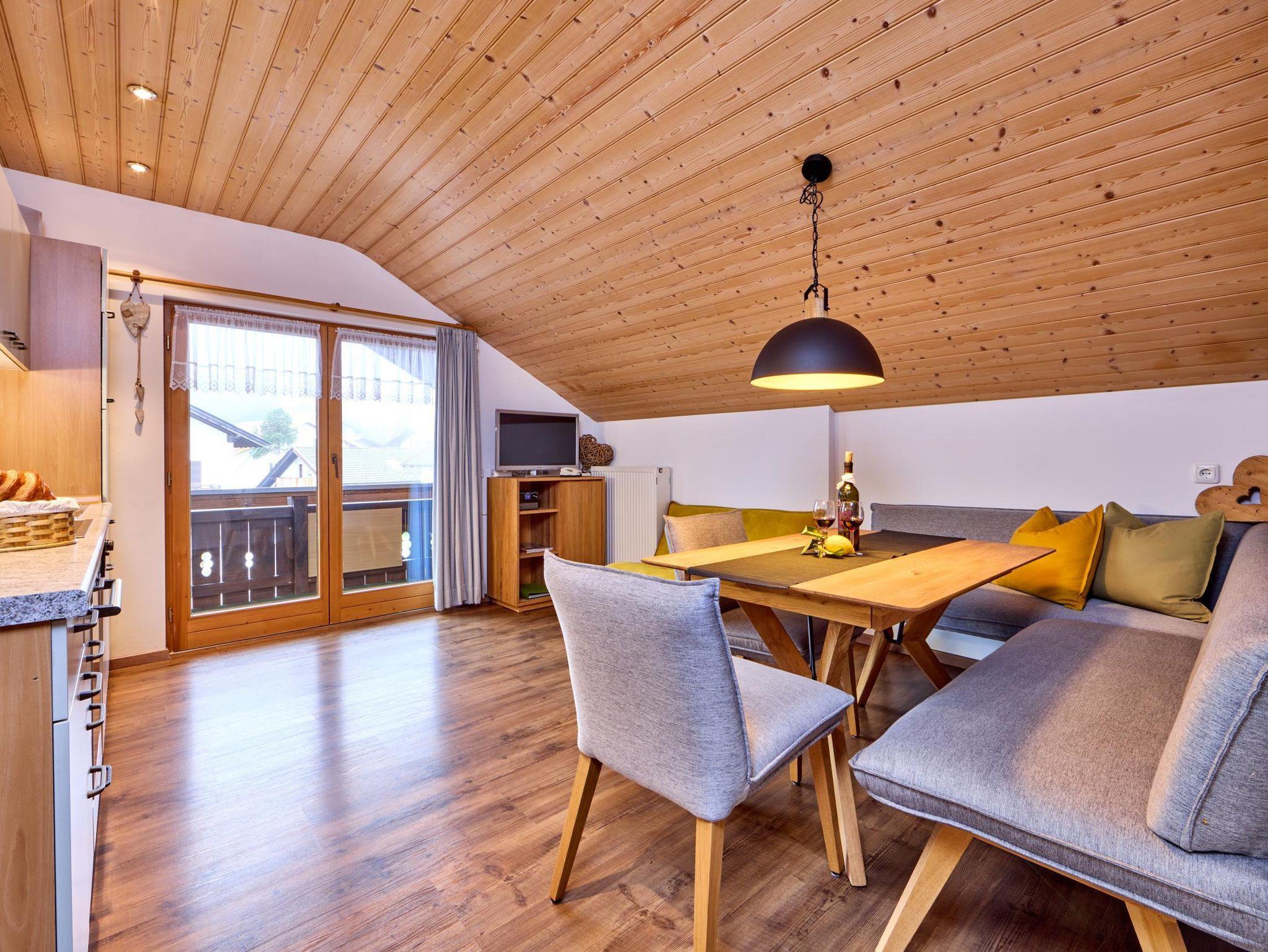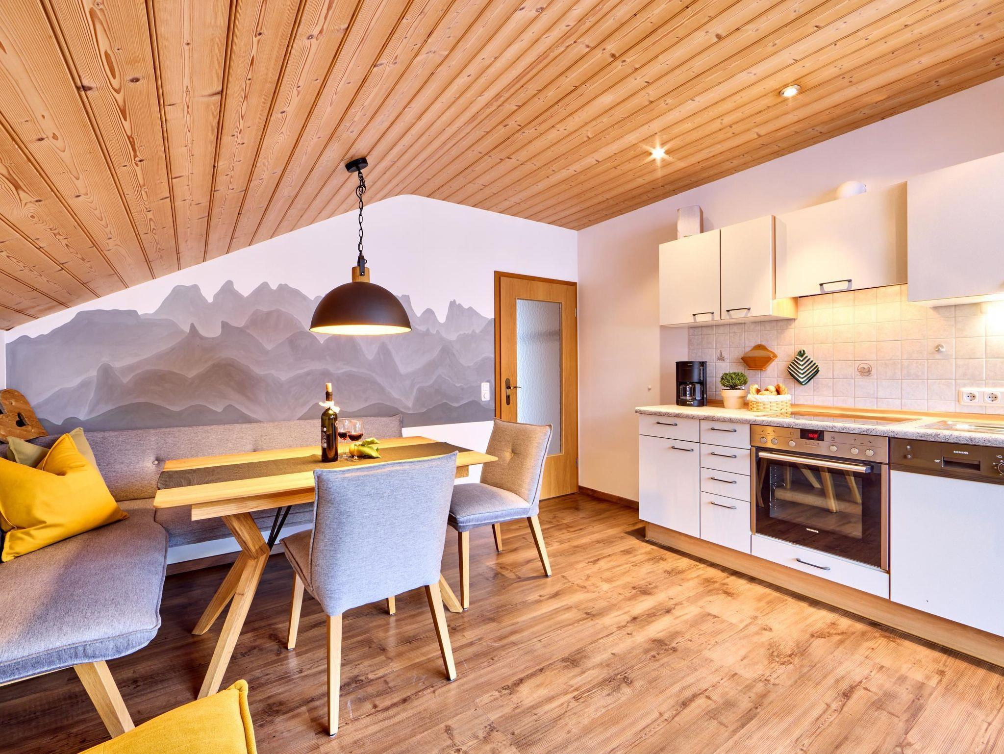 Komfortabel eingerichtete Ferienwohnung für 2 Personen im 2. Stock (Dachgeschoß). Die Wohnung ist aufgeteilt in 1 separates Schlafzimmer, eine Wohnküche mit großem Kühl- u. Gefrierschrank, 4-Plattenherd mit Backofen, Spülmaschine u.v.m. und Dusche/WC. Vom schönen Westbalkon genießen Sie bei Sonnenuntergang den freien Blick auf unseren Hausberg, das Hörnle.