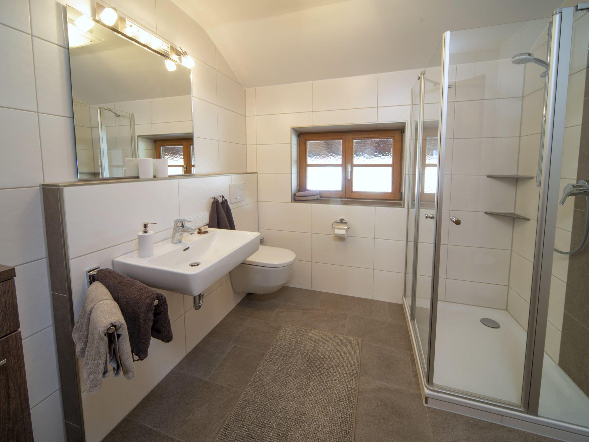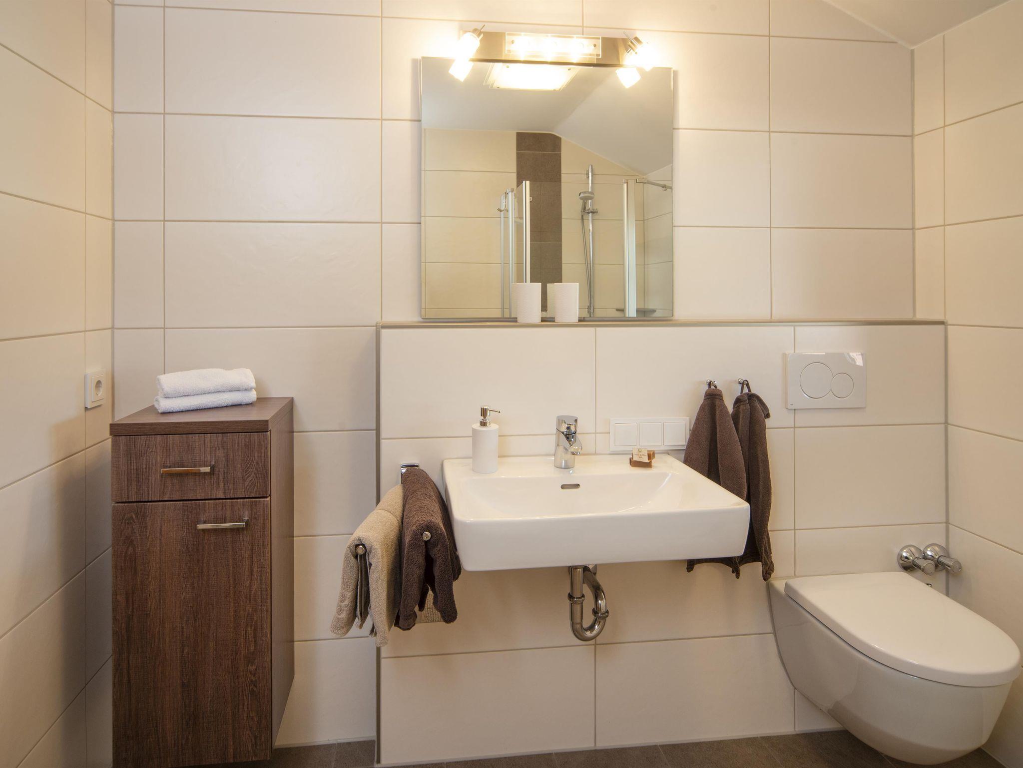 • Badezimmer mit begehbarer Dusche, WC, Handtuchtrockner, Fön, Bademäntel
