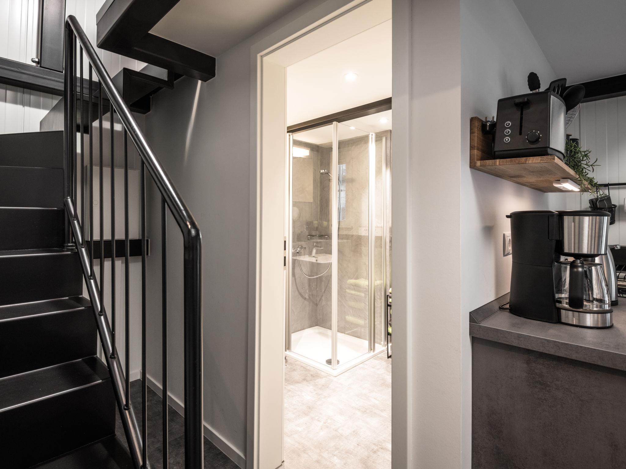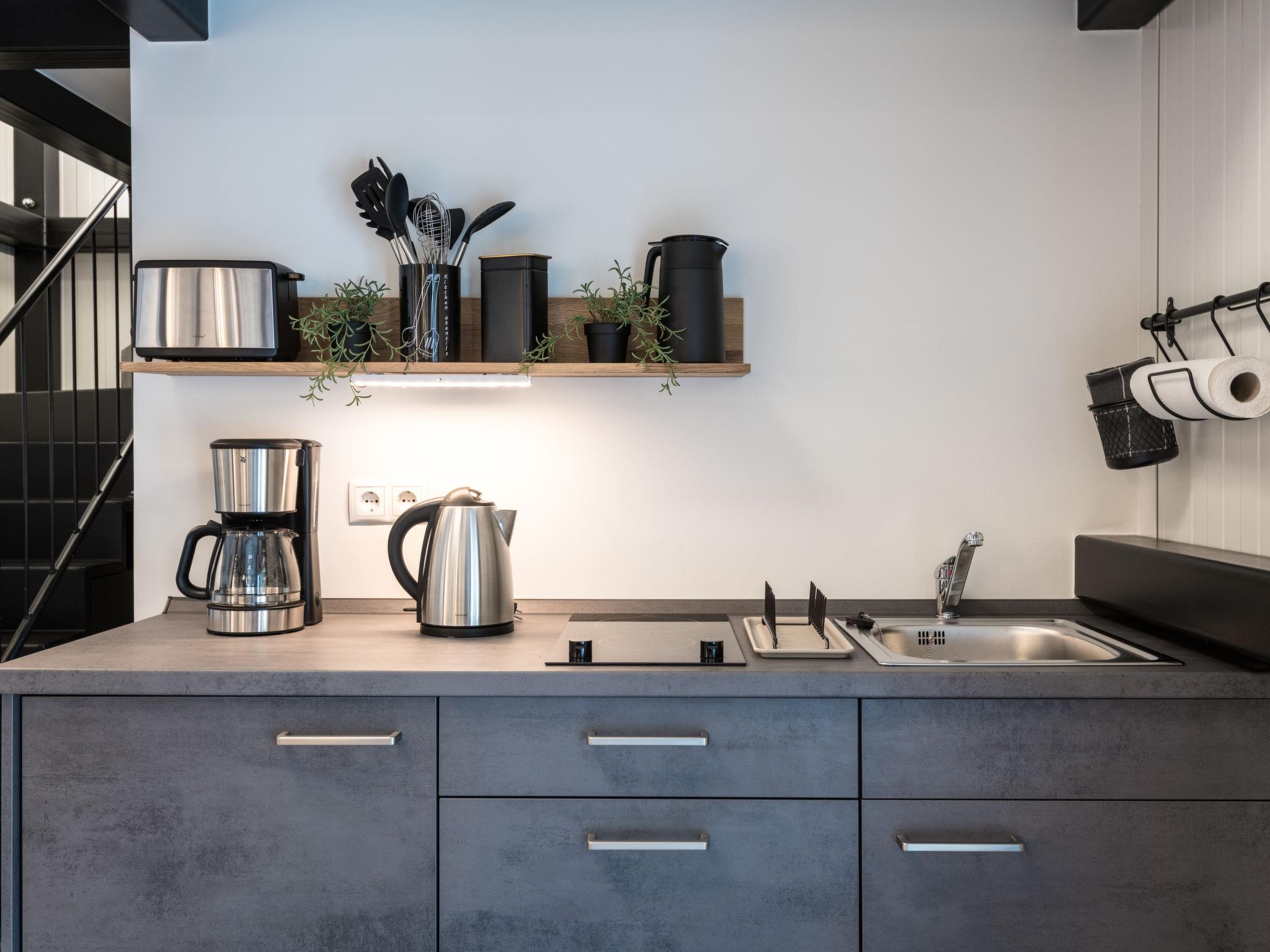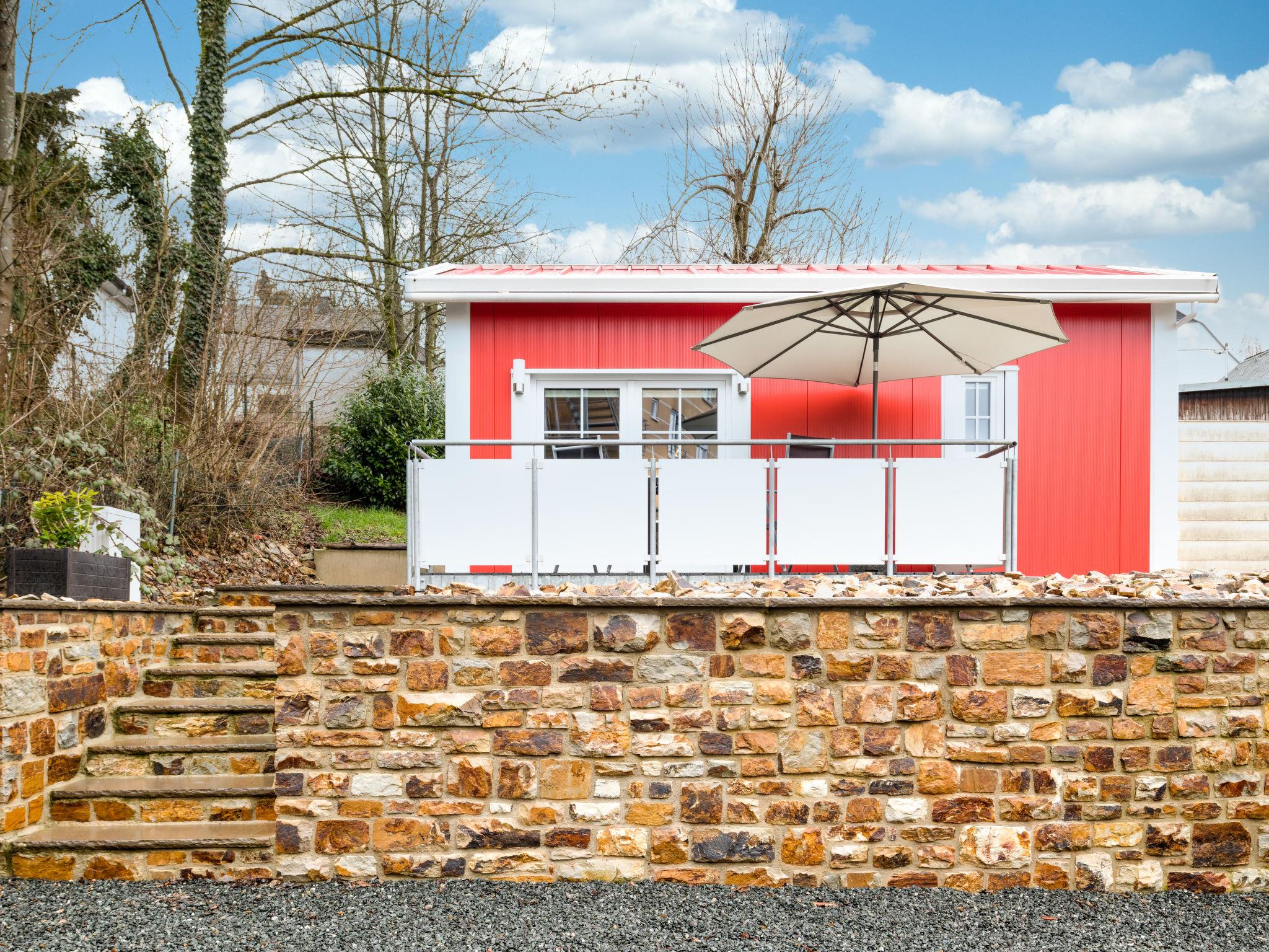 "Tiny Haus Westerwald 16 Red", 1-Zimmer-Haus 28 m2. Modern und gemütlich eingerichtet: Wohn-/Esszimmer, auf 2 Ebenen mit TV. Ausgang zur Terrasse. Abgeschrägte, offene Galerie, Deckenhöhe 1 - 120 cm, ohne Schrank mit 1 Doppelbett (160 cm, Länge 200 cm). Kochnische (2 Glaskeramikplatten, Toaster, Wasserkocher, elektrische Kaffeemaschine). Dusche/WC. Terrasse. Terrassenmöbel. Parkplatz beim Haus. Bitte beachten: Nichtraucher-Haus. Rauchmelder. Anstelle eines abgeschlossenen Schlafzimmers befinden sich manche Schlafplätze in einem offenen Bereich (Galerie, Nische etc.).