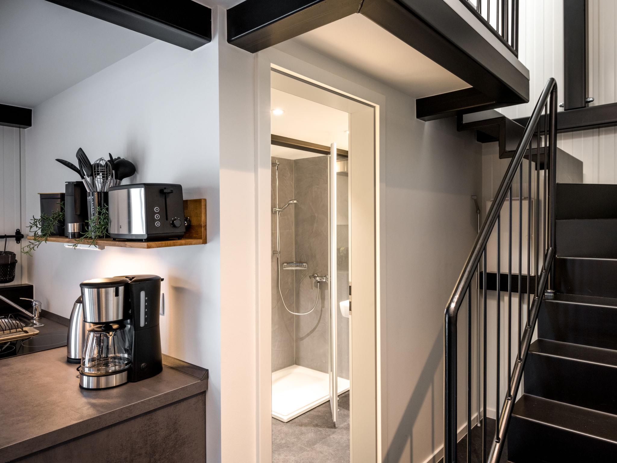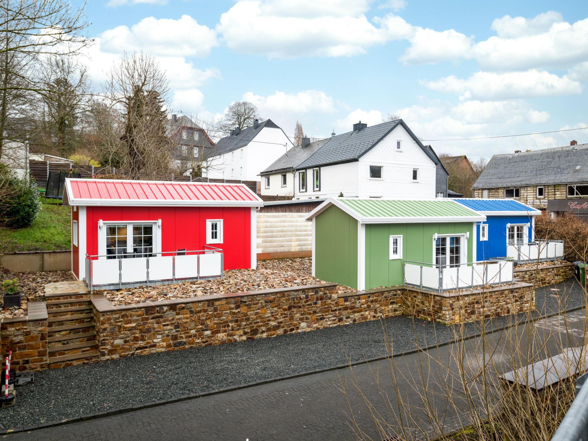 "Tiny Haus Westerwald 16 Green", 1-Zimmer-Haus 28 m2. Modern und gemütlich eingerichtet: Wohn-/Esszimmer, auf 2 Ebenen mit TV. Ausgang zur Terrasse. Abgeschrägte, offene Galerie, Deckenhöhe 1 - 120 cm, ohne Schrank mit 1 Doppelbett (160 cm, Länge 200 cm). Kochnische (2 Glaskeramikplatten, Toaster, Wasserkocher, elektrische Kaffeemaschine). Dusche/WC. Terrasse. Terrassenmöbel. Parkplatz beim Haus. Bitte beachten: Nichtraucher-Haus. Rauchmelder. Anstelle eines abgeschlossenen Schlafzimmers befinden sich manche Schlafplätze in einem offenen Bereich (Galerie, Nische etc.).