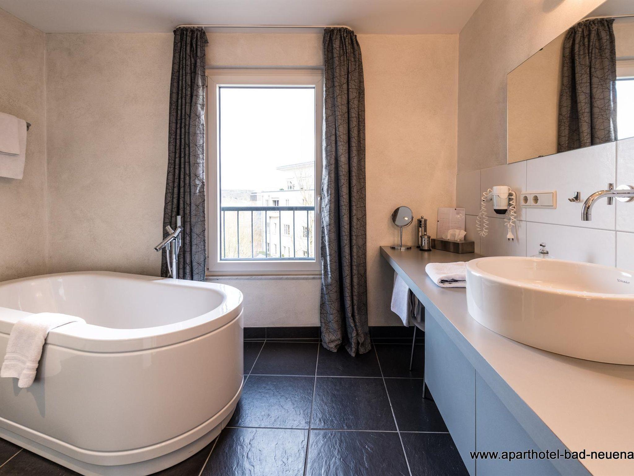 Stilvolles Badezimmer Das Badezimmer des Apartments Gloria ist ein echtes Highlight: Es bietet eine freistehende Badewanne für entspannende Momente und eine XXL-Erlebnisdusche für ein luxuriöses Duscherlebnis. Zusätzlich stehen Ihnen ein Fön, ein Kosmetikspiegel, Handtücher und Duschgel sowie ausreichend Ablagefläche zur Verfügung.