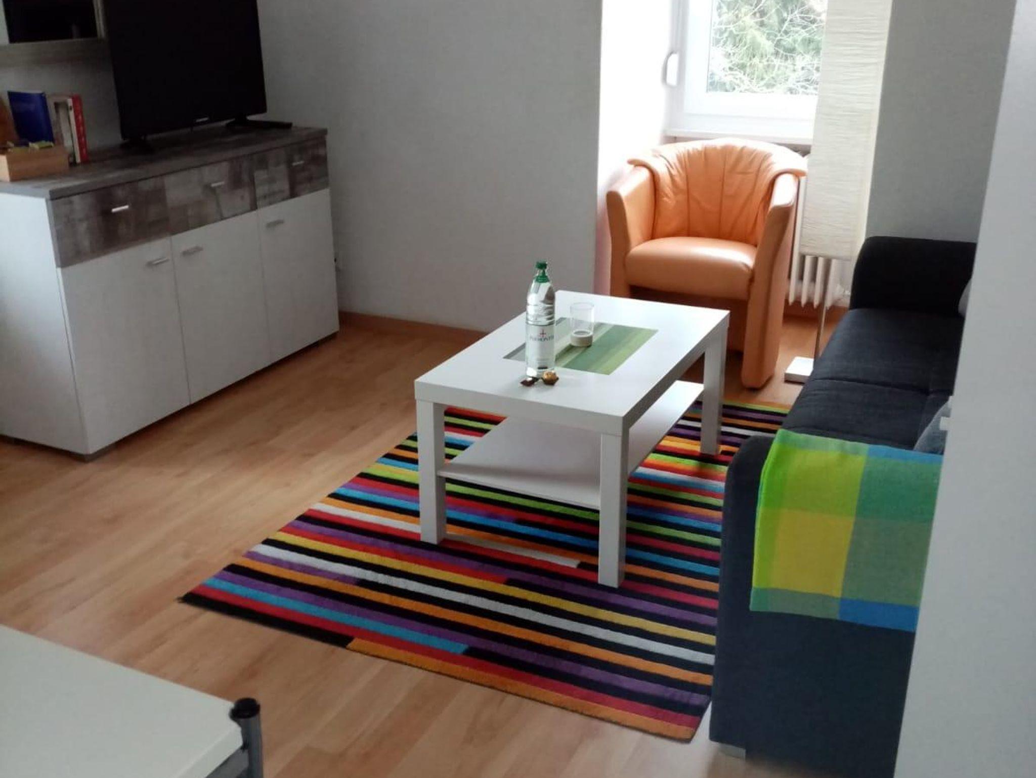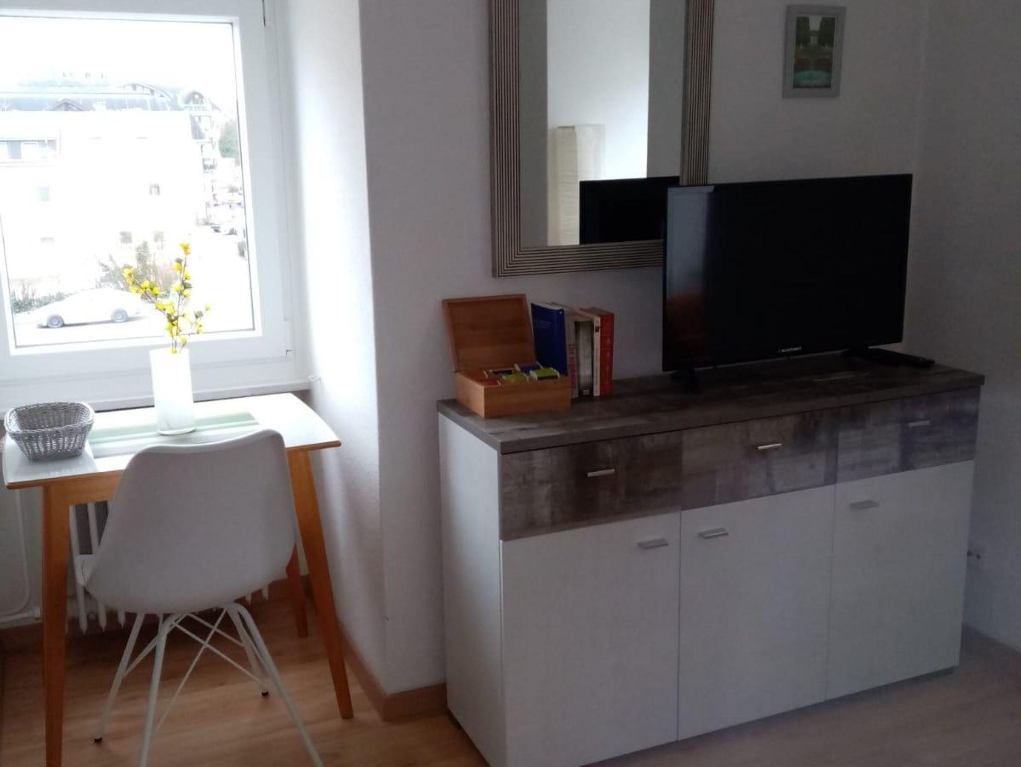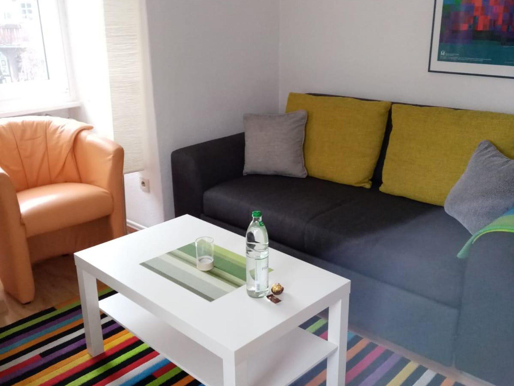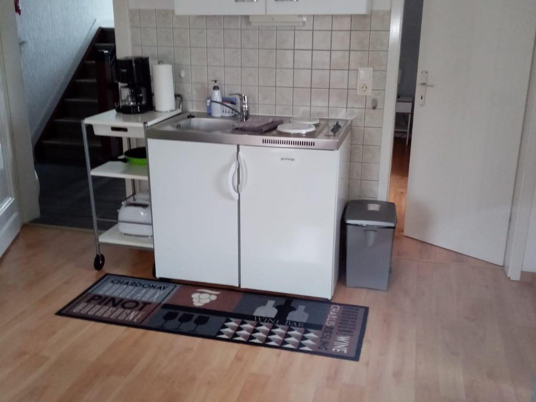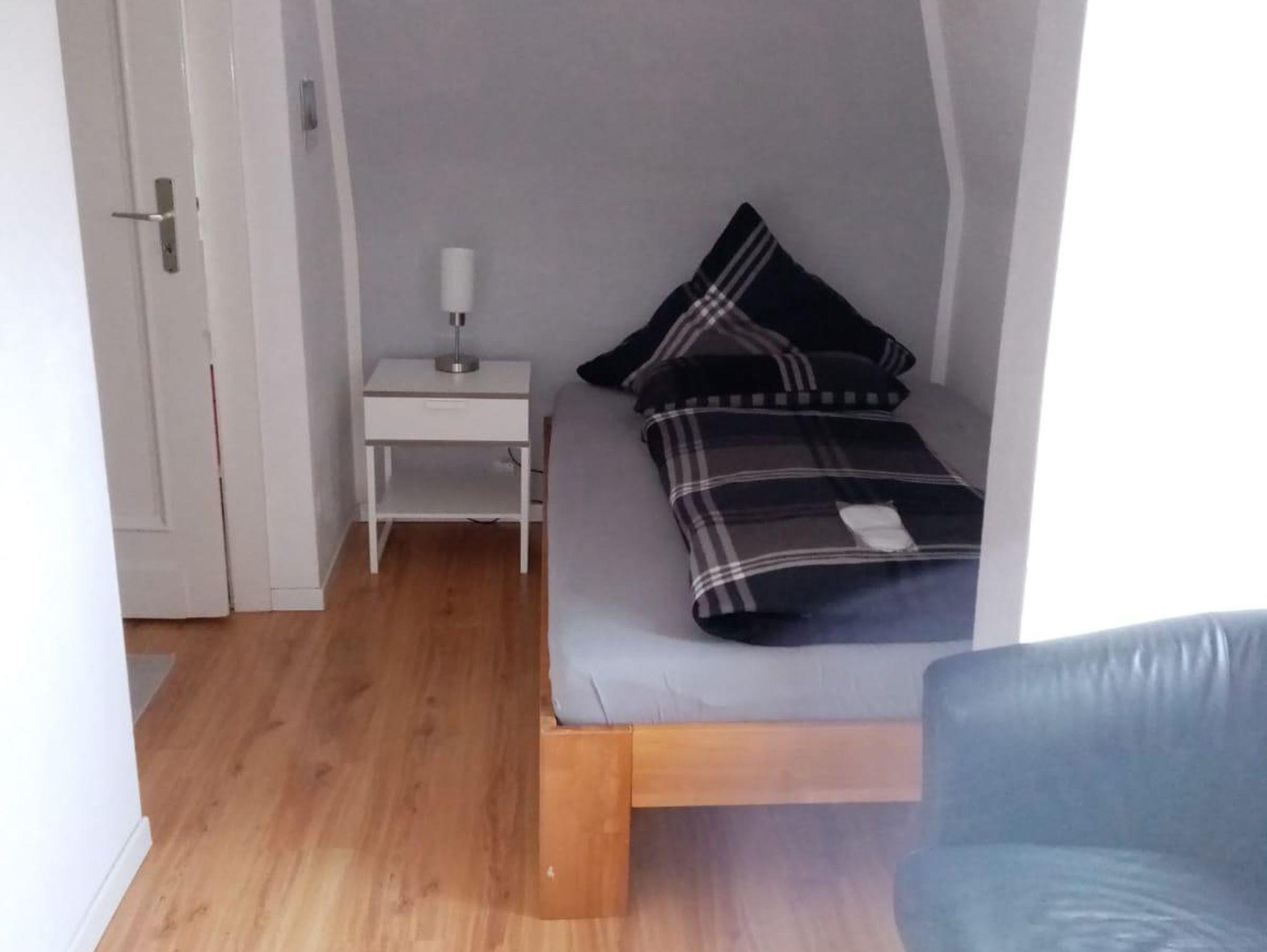 Diese helle und gemütliche kleinere 1,5 Zimmer Ferienwohnung bzw. Appartement (23 qm) befindet sich im 2. Obergeschoss links und ist bei Einzelpersonen mit max. 1 Kind und 2 Personen mit Wunsch nach getrennten Einzelbetten sehr gefragt. Trotz fehlendem Balkon strahlt es eine besondere Behaglichkeit aus. Sie kommen direkt in das Wohnzimmer mit einem Fernseher (Kabel-TV), sowie schneller Internetverbindung (WiFI) und einer kleinen Single-Küchennische und einem kleinen Esstisch für 1-2 Personen. Die Singleküche ist mit allem Notwendigen und folgenden Geräten ausgestattet: Spüle, Kochherd 2 Platten, Kühlschrank mit Gefrierfach, Toaster, Eierkocher, Kaffeemaschine und Wasserkocher. Eine Mikrowelle und ein Backofen können bei Bedarf in der gemeinsamen größeren Küche im EG genutzt werden.