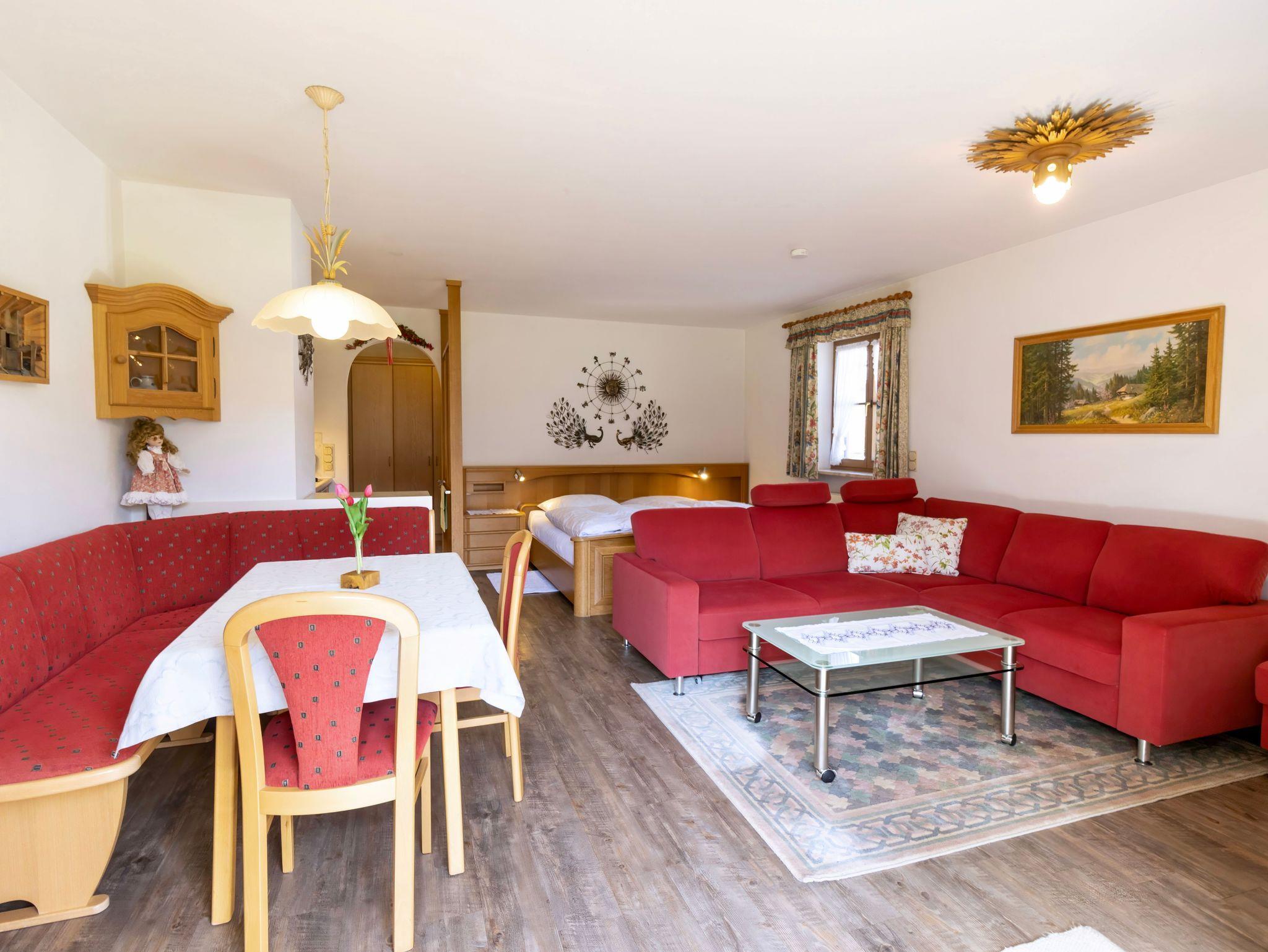 Das Appartement verfügt über eine gehobene Ausstattung mit einem stilvollen und kombinierten Wohn- und Schlafraum im gemütlichen Landhausstil, einer praktischen Küchenzeile sowie einem Bad mit Dusche und WC.